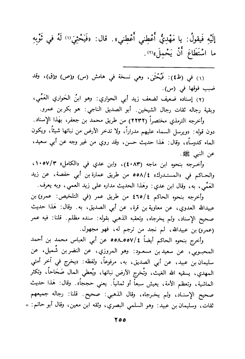 وأخرج بنحوه الحاكم أيضاً ٤/٥٥٧-٥٥٨ عن أبي العباس محمد بن أحمد المحبوبي، عن سعيد بن مسعود: وهو المروزي، عن النضر بن سميل، عن سليمان بن عبيد، عن أبي الصديق، به، مرفوعاً، ولفظه: "يخرج في آخر أمتي المهدي، يسقيه الله الغيث، وتخرج الأرض نباتها، ويعطي المال صحاحاً، وتكثر الماشية، وتعظم الأمة، يعيش سبعاً أو ثمانياً. يعني حججاً". وقال: هذا حديث