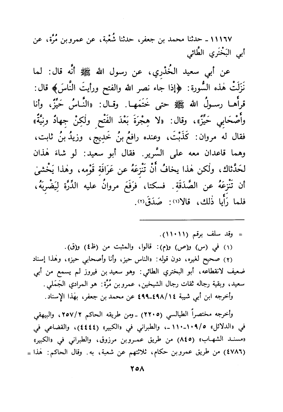 ١١١٦٧ - حَدَّثَنَا مُحَمَّدُ بْنُ جَعْفَرٍ، حَدَّثَنَا شُعْبَةُ، عَنْ عَمْرِو بْنِ مُرَّةَ، عَنْ أَبِي الْبَخْتَرِيِّ الطَّائِيِّ، عَنْ أَبِي سَعِيدٍ الْخُدْرِيِّ، عَنْ رَسُولِ اللهِ صَلَّى اللهُ عَلَيْهِ وَسَلَّمَ أَنَّهُ قَالَ: لَمَّا نَزَلَتْ هَذِهِ السُّورَةُ: إِذَا جَاءَ نَصْرُ اللهِ وَالْفَتْحُ وَرَأَيْتَ النَّاسَ قَالَ: قَرَأَهَا رَسُولُ اللهِ صَلَّى اللهُ عَلَيْهِ وَسَلَّمَ حَتَّى خَتَمَهَا، وَقَالَ: " النَّاسُ حَيِّزُ، وَأَنَا وَأَصْحَابِي حَيِّزُ "