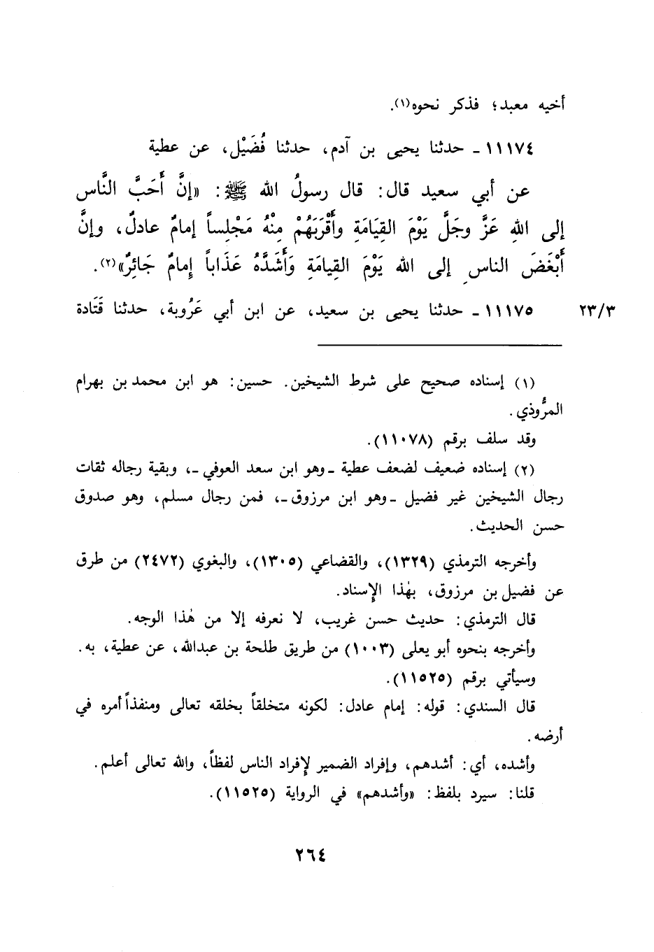 ١١١٧٤ - حَدَّثَنَا يَحْيَى بْنُ آدَمَ، حَدَّثَنَا فُضَيْلٌ، عَنْ عَطِيَّةَ، عَنْ أَبِي سَعِيدٍ، قَالَ: قَالَ رَسُولُ اللهِ صَلَّى اللهُ عَلَيْهِ وَسَلَّمَ: " إِنَّ أَحَبَّ النَّاسِ إِلَى اللهِ عَزَّ وَجَلَّ يَوْمَ الْقِيَامَةِ وَأَقْرَبَهُمْ مِنْهُ مَجْلِسًا: إِمَامٌ عَادِلٌ، وَإِنَّ أَبْغَضَ النَّاسِ إِلَى اللهِ يَوْمَ الْقِيَامَةِ وَأَشَدَّهُ عَذَابًا: إِمَامٌ جَائِرٌ " (٢)