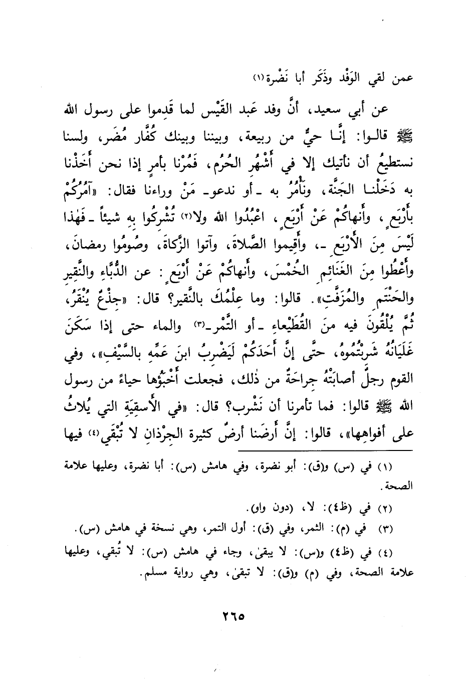 عَمَّنْ لَقِيَ الْوَفْدَ، وَذَكَرَ أَبَا نَضْرَةَ، (١) عَنْ أَبِي سَعِيدٍ، أَنَّ وَفْدَ عَبْدِ الْقَيْسِ لَمَّا قَدِمُوا عَلَى رَسُولِ اللهِ صَلَّى اللهُ عَلَيْهِ وَسَلَّمَ قَالُوا: إِنَّا حَيٌّ مِنْ رَبِيعَةَ، وَبَيْنَنَا وَبَيْنَكَ كُفَّارُ مُضَرَ، وَلَسْنَا نَسْتَطِيعُ أَنْ نَأْتِيَكَ إِلَّا فِي أَشْهُرِ الْحُرُمِ، فَمُرْنَا بِأَمْرٍ إِذَا نَحْنُ أَخَذْنَا بِهِ دَخَلْنَا الْجَنَّةَ، وَنَأْمُرُ بِهِ أَوْ نَدْعُو مَنْ وَرَاءَنَا، فَقَالَ: " آمُرُكُمْ بِأَرْبَعٍ، وَأَنْهَاكُمْ عَنْ أَرْبَعٍ: اعْبُدُوا اللهَ وَلَا (٢) تُشْرِكُوا بِهِ شَيْئًا فَهَذَا لَيْسَ مِنَ الْأَرْبَعِ، وَأَقِيمُوا الصَّلَاةَ، وَآتُوا الزَّكَاةَ، وَصُومُوا رَمَضَانَ، وَأَعْطُوا مِنَ الْغَنَائِمِ الْخُمُسَ، وَأَنْهَاكُمْ عَنْ أَرْبَعٍ عَنِ الدُّبَّاءِ، وَالنَّقِيرِ، وَالْحَنْتَمِ، وَالْمُزَفَّتِ " قَالُوا: وَمَا عِلْمُكَ بِالنَّقِيرِ؟ قَالَ: " جِذْعٌ يُنْقَرُ، ثُمَّ يُلْقُونَ فِيهِ مِنَ الْقُطَيْعَاءِ أَوِ التَّمْرِ (٣) وَالْمَاءِ، حَتَّى إِذَا سَكَنَ غَلَيَانُهُ شَرِبْتُمُوهُ حَتَّى إِنَّ أَحَدَكُمْ لَيَضْرِبُ ابْنَ عَمِّهِ بِالسَّيْفِ "، وَفِي الْقَوْمِ رَجُلٌ أَصَابَتْهُ جِرَاحَةٌ مِنْ ذَلِكَ، فَجَعَلْتُ أُخَبِّئُهَا حَيَاءً مِنْ رَسُولِ اللهِ صَلَّى اللهُ عَلَيْهِ وَسَلَّمَ، قَالُوا: فَمَا تَأْمُرُنَا أَنْ نَشْرَبَ؟ قَالَ: " فِي الْأَسْقِيَةِ الَّتِي يُلَاثُ عَلَى أَفْوَاهِهَا " قَالُوا: إِنَّ أَرْضَنَا أَرْضٌ كَثِيرَةُ الْجُرْذَانِ لَا تَبْقَى (٤) فِيهَا