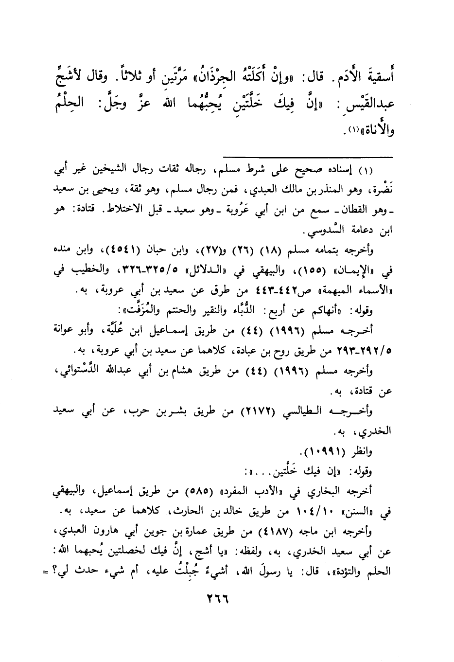 أَسْقِيَةُ الْأُدُمِ، قَالَ: " وَإِنْ أَكَلَتْهُ الْجُرْذَانُ " مَرَّتَيْنِ أَوْ ثَلَاثًا، وَقَالَ لِأَشَجِّ عَبْدِ الْقَيْسِ " إِنَّ فِيكَ خَلَّتَيْنِ يُحِبُّهُمَا اللهُ عَزَّ وَجَلَّ الْحِلْمُ، وَالْأَنَاةُ " (١)