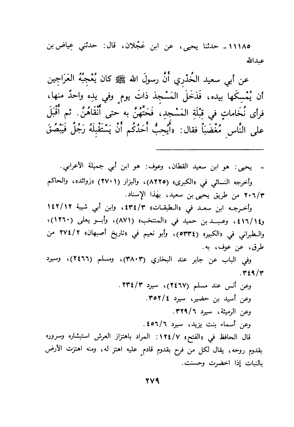 ١١١٨٥ - حَدَّثَنَا يَحْيَى، عَنِ ابْنِ عَجْلَانَ، قَالَ: حَدَّثَنِي عِيَاضُ بْنُ عَبْدِ اللهِ، عَنْ أَبِي سَعِيدٍ الْخُدْرِيِّ، أَنَّ رَسُولَ اللهِ صَلَّى اللهُ عَلَيْهِ وَسَلَّمَ كَانَ يُعْجِبُهُ الْعَرَاجِينُ أَنْ يُمْسِكَهَا بِيَدِهِ، فَدَخَلَ الْمَسْجِدَ ذَاتَ يَوْمٍ وَفِي يَدِهِ وَاحِدٌ مِنْهَا، فَرَأَى نُخَامَاتٍ فِي قِبْلَةِ الْمَسْجِدِ، فَحَتَّهُنَّ بِهِ حَتَّى أَنْقَاهُنَّ، ثُمَّ أَقْبَلَ عَلَى النَّاسِ مُغْضَبًا، فَقَالَ: " أَيُحِبُّ أَحَدُكُمْ أَنْ يَسْتَقْبِلَهُ رَجُلٌ فَيَبْصُقَ