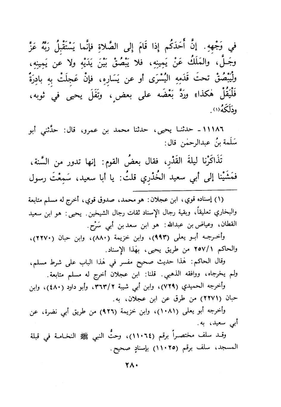 ١١١٨٦ - حَدَّثَنَا يَحْيَى، حَدَّثَنَا مُحَمَّدُ بْنُ عَمْرٍو، قَالَ: حَدَّثَنِي أَبُو سَلَمَةَ بْنُ عَبْدِ الرَّحْمَنِ، قَالَ: تَذَاكَرْنَا لَيْلَةَ الْقَدْرِ، فَقَالَ بَعْضُ الْقَوْمِ: إِنَّهَا تَدُورُ مِنَ السَّنَةِ، فَمَشَيْنَا إِلَى أَبِي سَعِيدٍ الْخُدْرِيِّ، قُلْتُ: يَا أَبَا سَعِيدٍ سَمِعْتَ رَسُولَ