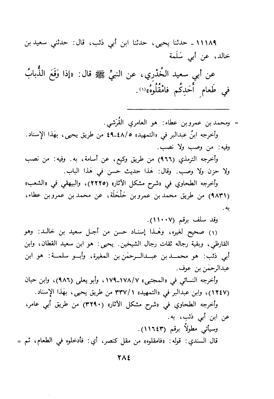١١١٨٩ - حَدَّثَنَا يَحْيَى، حَدَّثَنَا ابْنُ أَبِي ذِئْبٍ، قَالَ: حَدَّثَنِي سَعِيدُ بْنُ خَالِدٍ، عَنْ أَبِي سَلَمَةَ، عَنْ أَبِي سَعِيدٍ الْخُدْرِيِّ، عَنِ النَّبِيِّ صَلَّى اللهُ عَلَيْهِ وَسَلَّمَ قَالَ: " إِذَا وَقَعَ الذُّبَابُ فِي طَعَامِ أَحَدِكُمْ فَامْقُلُوهُ " (١)