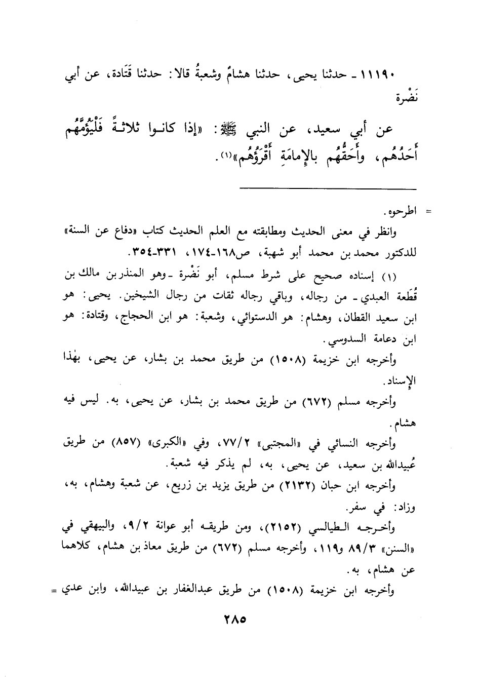 ١١١٩٠ - حَدَّثَنَا يَحْيَى، حَدَّثَنَا هِشَامٌ، وَشُعْبَةُ، قَالَا: حَدَّثَنَا قَتَادَةُ، عَنْ أَبِي نَضْرَةَ، عَنْ أَبِي سَعِيدٍ، عَنِ النَّبِيِّ صَلَّى اللهُ عَلَيْهِ وَسَلَّمَ " إِذَا كَانُوا ثَلَاثَةً فَلْيَؤُمَّهُمْ أَحَدُهُمْ، وَأَحَقُّهُمْ بِالْإِمَامَةِ أَقْرَؤُهُمْ " (١)