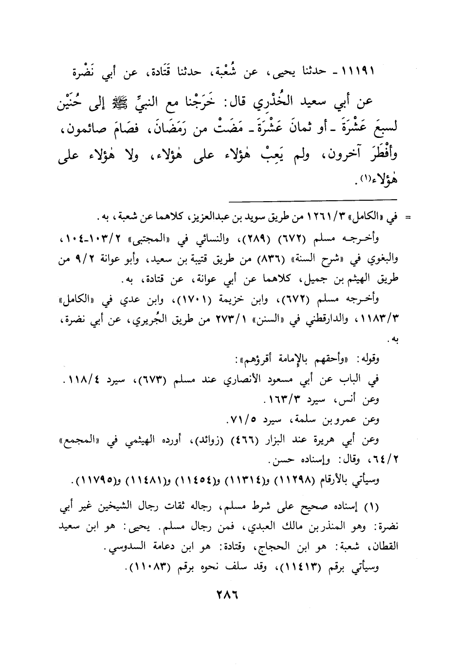١١١٩١ - حَدَّثَنَا يَحْيَى، عَنْ شُعْبَةَ، حَدَّثَنَا قَتَادَةُ، عَنْ أَبِي نَضْرَةَ، عَنْ أَبِي سَعِيدٍ الْخُدْرِيِّ، قَالَ: " خَرَجْنَا مَعَ النَّبِيِّ صَلَّى اللهُ عَلَيْهِ وَسَلَّمَ إِلَى حُنَيْنٍ لِسَبْعَ عَشْرَةَ - أَوْ ثَمَانِ عَشْرَةَ - مَضَتْ مِنْ رَمَضَانَ فَصَامَ صَائِمُونَ وَأَفْطَرَ آخَرُونَ، وَلَمْ يَعِبْ هَؤُلَاءِ عَلَى هَؤُلَاءِ، وَلَا هَؤُلَاءِ عَلَى هَؤُلَاءِ " (١)