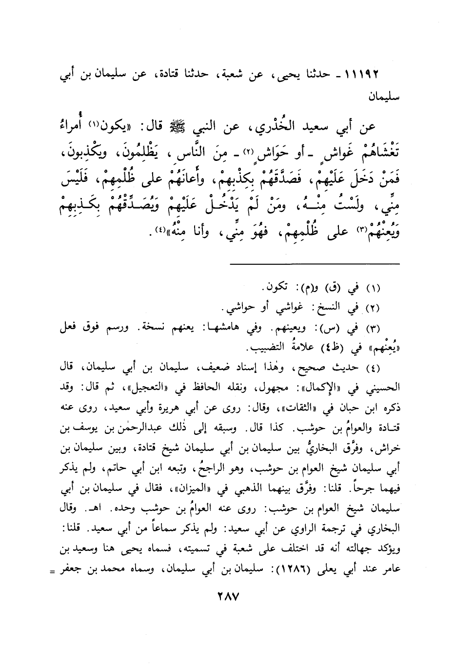 ١١١٩٢ - حَدَّثَنَا يَحْيَى، عَنْ شُعْبَةَ، حَدَّثَنَا قَتَادَةُ، عَنْ سُلَيْمَانَ بْنِ أَبِي سُلَيْمَانَ، عَنْ أَبِي سَعِيدٍ الْخُدْرِيِّ، عَنِ النَّبِيِّ صَلَّى اللهُ عَلَيْهِ وَسَلَّمَ قَالَ: " يَكُونُ (١) أُمَرَاءُ تَغْشَاهُمْ غَوَاشٍ - أَوْ حَوَاشٍ (٢) - مِنَ النَّاسِ يَظْلِمُونَ وَيَكْذِبُونَ، فَمَنْ دَخَلَ عَلَيْهِمْ فَصَدَّقَهُمْ بِكَذِبِهِمْ، وَأَعَانَهُمْ عَلَى ظُلْمِهِمْ فَلَيْسَ مِنِّي وَلَسْتُ مِنْهُ، وَمَنْ لَمْ يَدْخُلْ عَلَيْهِمْ وَيُصَدِّقْهُمْ بِكَذِبِهِمْ، وَيُعِنْهُمْ (٣) عَلَى ظُلْمِهِمْ فَهُوَ مِنِّي وَأَنَا مِنْهُ " (٤)
