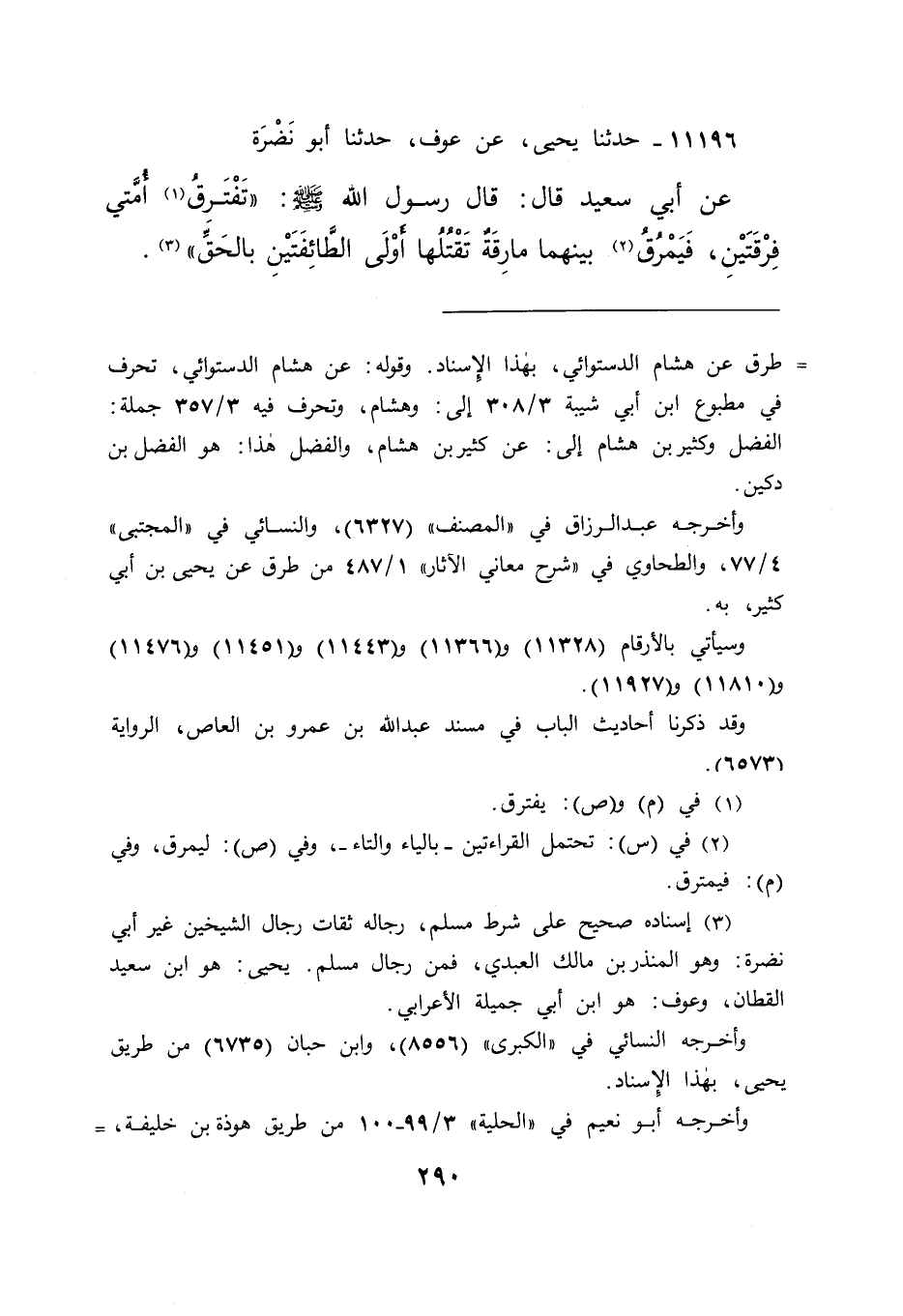 ١١١٩٦ - حَدَّثَنَا يَحْيَى، عَنْ عَوْفٍ، حَدَّثَنَا أَبُو نَضْرَةَ، عَنْ أَبِي سَعِيدٍ، قَالَ: قَالَ رَسُولُ اللهِ صَلَّى اللهُ عَلَيْهِ وَسَلَّمَ: " تَفْتَرِقُ (١) أُمَّتِي فِرْقَتَيْنِ فَيَمْرُقُ (٢) بَيْنَهُمَا مَارِقَةٌ تَقْتُلُهَا أَوْلَى الطَّائِفَتَيْنِ بِالْحَقِّ " (٣)