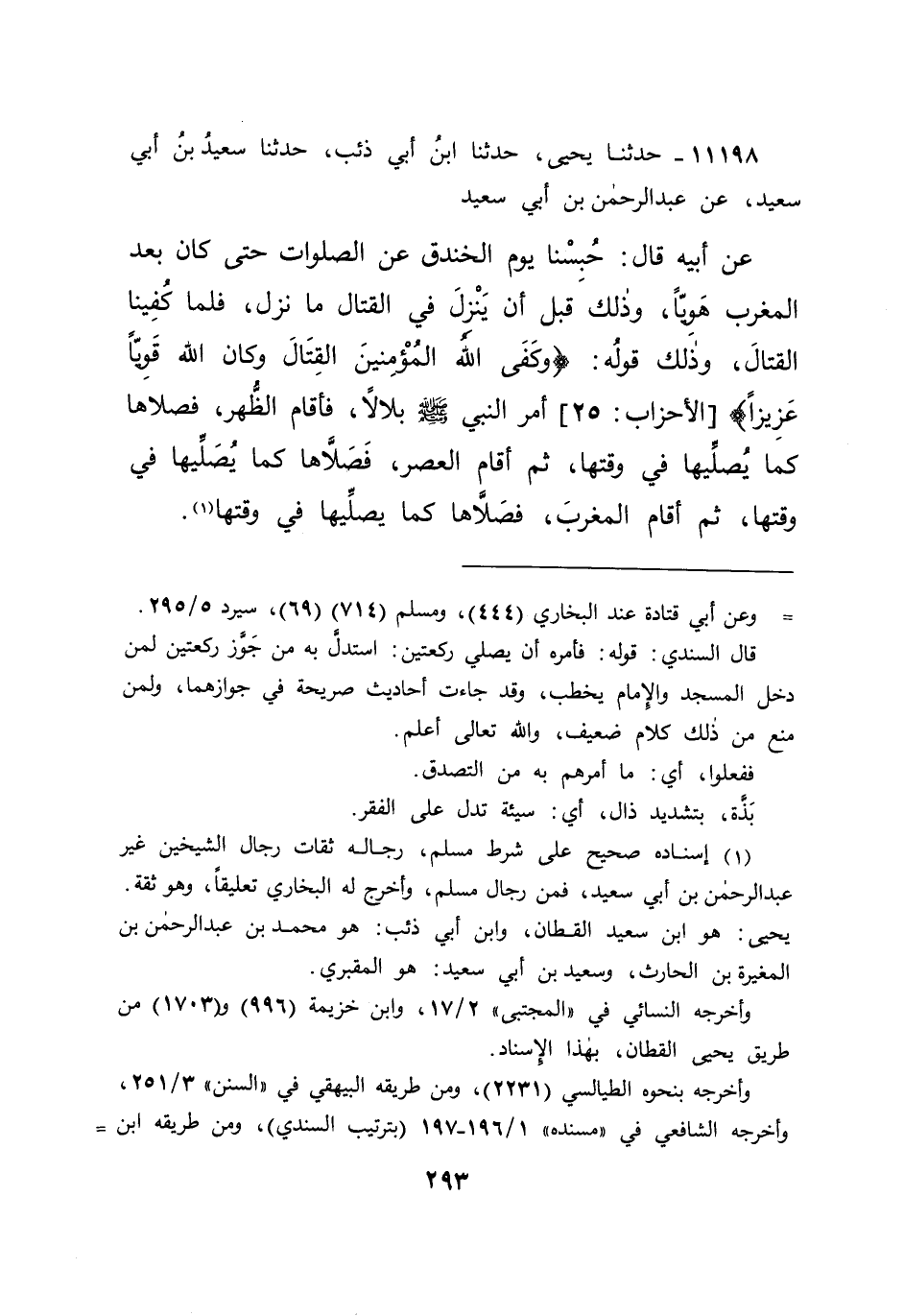 ١١١٩٨ - حَدَّثَنَا يَحْيَى، حَدَّثَنَا ابْنُ أَبِي ذِئْبٍ، حَدَّثَنَا سَعِيدُ بْنُ أَبِي سَعِيدٍ، عَنْ عَبْدِ الرَّحْمَنِ بْنِ أَبِي سَعِيدٍ، عَنْ أَبِيهِ، قَالَ: حُبِسْنَا يَوْمَ الْخَنْدَقِ عَنِ الصَّلَوَاتِ حَتَّى كَانَ بَعْدَ الْمَغْرِبِ هَوِيًّا، وَذَلِكَ قَبْلَ أَنْ يَنْزِلَ فِي الْقِتَالِ مَا نَزَلَ، فَلَمَّا كُفِينَا الْقِتَالَ، وَذَلِكَ قَوْلُهُ: {وَكَفَى اللهُ الْمُؤْمِنِينَ الْقِتَالَ وَكَانَ اللهُ قَوِيًّا عَزِيزًا} [الأحزاب: ٢٥] " أَمَرَ النَّبِيُّ صَلَّى اللهُ عَلَيْهِ وَسَلَّمَ بِلَالًا فَأَقَامَ الظُّهْرَ، فَصَلَّاهَا كَمَا يُصَلِّيهَا فِي وَقْتِهَا، ثُمَّ أَقَامَ الْعَصْرَ فَصَلَّاهَا كَمَا يُصَلِّيهَا فِي وَقْتِهَا، ثُمَّ أَقَامَ الْمَغْرِبَ فَصَلَّاهَا كَمَا يُصَلِّيهَا فِي وَقْتِهَا " (١)
