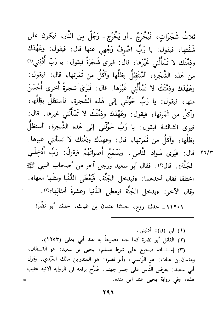 ثَلَاثُ شَجَرَاتٍ فَيَخْرُجُ - أَوْ يَخْرُجُ - رَجُلٌ مِنَ النَّارِ فَيَكُونُ عَلَى شَفَتِهَا، فَيَقُولُ: يَا رَبِّ اصْرِفْ وَجْهِي عَنْهَا، قَالَ: فَيَقُولُ: وَعَهْدِكَ وَذِمَّتِكَ لَا تَسْأَلُنِي غَيْرَهَا. قَالَ: فَيَرَى شَجَرَةً، فَيَقُولُ: يَا رَبِّ أَدْنِنِي (١) مِنْ هَذِهِ الشَّجَرَةِ أَسْتَظِلُّ بِظِلِّهَا، وَآكُلُ مِنْ ثَمَرَتِهَا، قَالَ: فَيَقُولُ: وَعَهْدِكَ وَذِمَّتِكَ لَا تَسْأَلُنِي غَيْرَهَا. قَالَ: فَيَرَى شَجَرَةً أُخْرَى أَحْسَنَ مِنْهَا، فَيَقُولُ: يَا رَبِّ حَوِّلْنِي إِلَى هَذِهِ الشَّجَرَةِ، فَأَسْتَظِلَّ بِظِلِّهَا، وَآكُلَ مِنْ ثَمَرَتِهَا، فَيَقُولُ: وَعَهْدِكَ وَذِمَّتِكَ لَا تَسْأَلُنِي غَيْرَهَا. قَالَ: فَيَرَى الثَّالِثَةَ، فَيَقُولُ: يَا رَبِّ حَوِّلْنِي إِلَى هَذِهِ الشَّجَرَةِ أَسْتَظِلُّ بِظِلِّهَا، وَآكُلُ مِنْ ثَمَرَتِهَا، قَالَ: وَعَهْدِكَ وَذِمَّتِكَ لَا تَسْأَلُنِي غَيْرَهَا. قَالَ: فَيَرَى سَوَادَ النَّاسِ، وَيَسْمَعُ أَصْوَاتَهُمْ، فَيَقُولُ: رَبِّ أَدْخِلْنِي الْجَنَّةَ "، قَالَ (٢) : فَقَالَ أَبُو سَعِيدٍ: وَرَجُلٌ آخَرُ مِنْ أَصْحَابِ النَّبِيِّ صَلَّى اللهُ عَلَيْهِ وَسَلَّمَ اخْتَلَفَا، فَقَالَ أَحَدُهُمَا: " فَيَدْخُلُ الْجَنَّةَ فَيُعْطَى الدُّنْيَا وَمِثْلَهَا مَعَهَا "، وَقَالَ الْآخَرُ: " يُدْخَلُ الْجَنَّةَ فَيُعْطَى الدُّنْيَا وَعَشَرَةَ أَمْثَالِهَا " (٣)