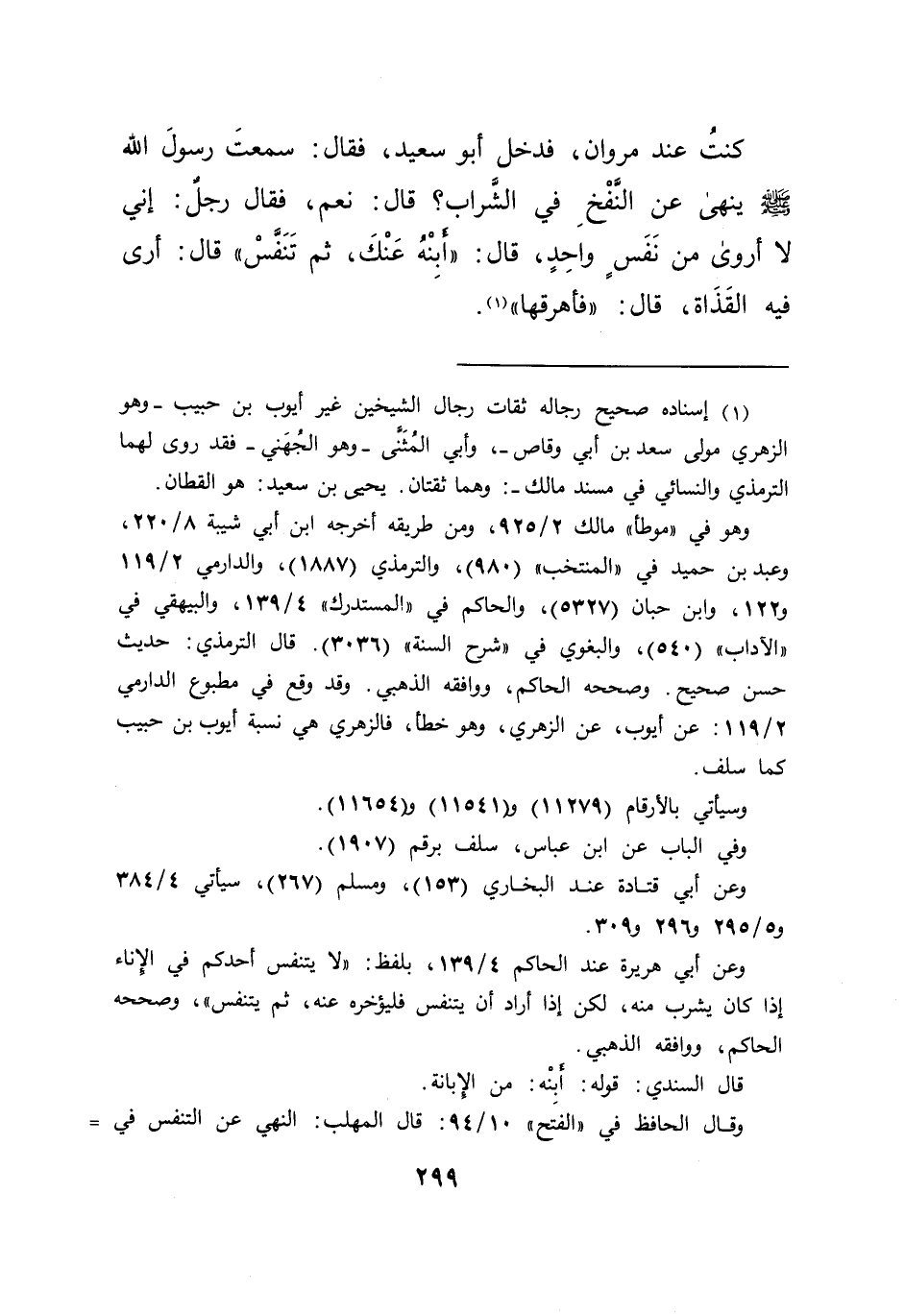 كُنْتُ عِنْدَ مَرْوَانَ فَدَخَلَ أَبُو سَعِيدٍ، فَقَالَ: سَمِعْتُ رَسُولَ اللهِ صَلَّى اللهُ عَلَيْهِ وَسَلَّمَ يَنْهَى عَنِ النَّفْخِ فِي الشَّرَابِ؟ قَالَ: نَعَمْ، فَقَالَ رَجُلٌ: إِنِّي لَا أُرْوَى مِنْ نَفَسٍ وَاحِدٍ، قَالَ: " أَبِنْهُ عَنْكَ، ثُمَّ تَنَفَّسْ "، قَالَ: أَرَى فِيهِ الْقَذَاةَ، قَالَ: " فَأَهْرِقْهَا " (١)