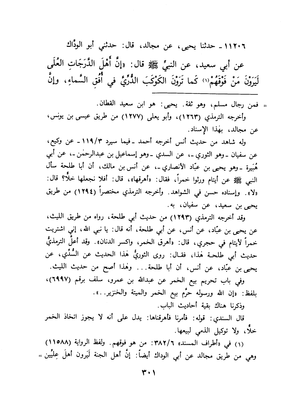 ١١٢٠٦ - حَدَّثَنَا يَحْيَى، عَنْ مُجَالِدٍ، قَالَ: حَدَّثَنِي أَبُو الْوَدَّاكِ، عَنْ أَبِي سَعِيدٍ، عَنِ النَّبِيِّ صَلَّى اللهُ عَلَيْهِ وَسَلَّمَ قَالَ: " إِنَّ أَهْلَ الدَّرَجَاتِ الْعُلَى لَيَرَوْنَ مَنْ فَوْقَهُمْ (١) ، كَمَا تَرَوْنَ الْكَوْكَبَ الدُّرِّيَّ فِي أُفُقِ السَّمَاءِ، وَإِنَّ