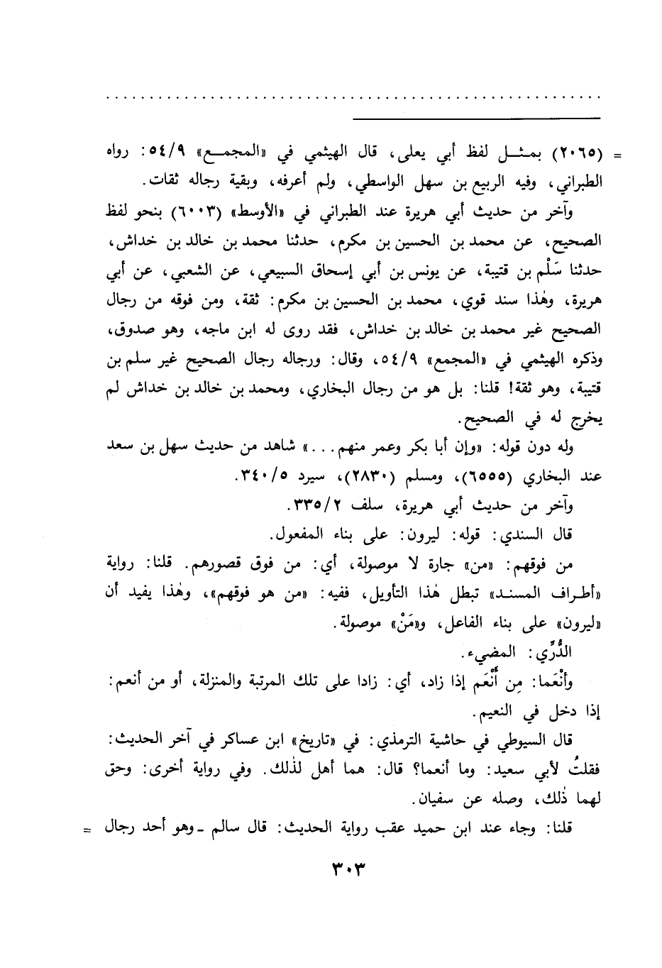 من فوقهم: "من" جارة لا موصولة، أي: من فوق قصورهم. قلنا: رواية "أطراف المسند" تبطل هذا التأويل، ففيه: "من هو فوقهم"، وهذا يفيد أن "ليرون" على بناء الفاعل، و"منْ" موصولة.