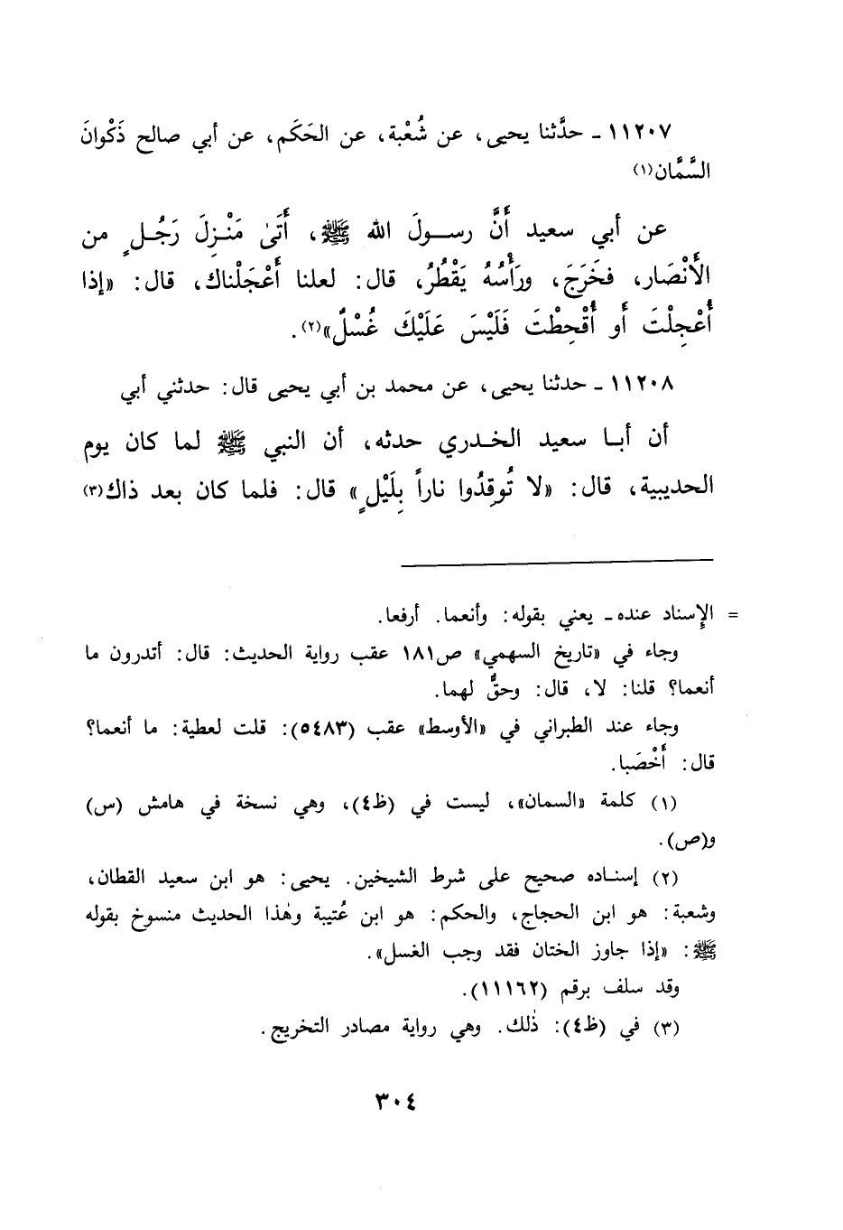 ١١٢٠٧ - حَدَّثَنَا يَحْيَى، عَنْ شُعْبَةَ، عَنِ الْحَكَمِ، عَنْ أَبِي صَالِحٍ ذَكْوَانَ السَّمَّانِ (١) ، عَنْ أَبِي سَعِيدٍ: أَنَّ رَسُولَ اللهِ صَلَّى اللهُ عَلَيْهِ وَسَلَّمَ أَتَى مَنْزِلَ رَجُلٍ مِنَ الْأَنْصَارِ، فَخَرَجَ وَرَأْسُهُ يَقْطُرُ قَالَ: " لَعَلَّنَا أَعْجَلْنَاكَ " قَالَ: " إِذَا أُعْجِلْتَ - أَوْ أُقْحِطْتَ - فَلَيْسَ عَلَيْكَ غُسْلٌ " (٢)