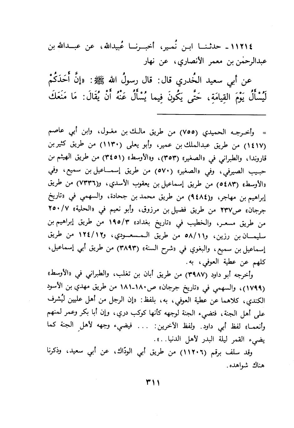 ١١٢١٤ - حَدَّثَنَا ابْنُ نُمَيْرٍ، أَخْبَرَنَا عُبَيْدُ اللهِ، عَنْ عَبْدِ اللهِ بْنِ عَبْدِ الرَّحْمَنِ بْنِ مَعْمَرٍ الْأَنْصَارِيِّ، عَنْ نَهَارٍ، عَنْ أَبِي سَعِيدٍ الْخُدْرِيِّ، قَالَ: قَالَ رَسُولُ اللهِ صَلَّى اللهُ عَلَيْهِ وَسَلَّمَ: " إِنَّ أَحَدَكُمْ لَيُسْأَلُ يَوْمَ الْقِيَامَةِ حَتَّى يَكُونَ فِيمَا يُسْأَلُ عَنْهُ أَنْ يُقَالَ: مَا مَنَعَكَ