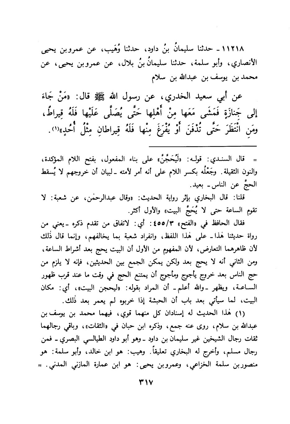 ١١٢١٨ - حَدَّثَنَا سُلَيْمَانُ بْنُ دَاوُدَ، حَدَّثَنَا وُهَيْبٌ، عَنْ عَمْرِو بْنِ يَحْيَى الْأَنْصَارِيِّ، وَأَبُو سَلَمَةَ، حَدَّثَنَا سُلَيْمَانُ بْنُ بِلَالٍ، عَنْ عَمْرِو بْنِ يَحْيَى، عَنْ مُحَمَّدِ بْنِ يُوسُفَ بْنِ عَبْدِ اللهِ بْنِ سَلَامٍ، عَنْ أَبِي سَعِيدٍ الْخُدْرِيِّ، عَنْ رَسُولِ اللهِ صَلَّى اللهُ عَلَيْهِ وَسَلَّمَ قَالَ: " مَنْ جَاءَ إِلَى جَنَازَةٍ فَمَشَى مَعَهَا مِنْ أَهْلِهَا حَتَّى يُصَلَّى عَلَيْهَا فَلَهُ قِيرَاطٌ، وَمَنْ انْتَظَرَ حَتَّى تُدْفَنَ، أَوْ يُفْرَغَ مِنْهَا فَلَهُ قِيرَاطَانِ مِثْلُ أُحُدٍ " (١)