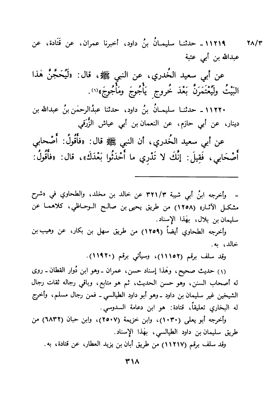 ١١٢١٩ - حَدَّثَنَا سُلَيْمَانُ بْنُ دَاوُدَ، أَخْبَرَنَا عِمْرَانُ، عَنْ قَتَادَةَ، عَنْ عَبْدِ اللهِ بْنِ أَبِي عُتْبَةَ، عَنْ أَبِي سَعِيدٍ الْخُدْرِيِّ، عَنِ النَّبِيِّ صَلَّى اللهُ عَلَيْهِ وَسَلَّمَ قَالَ: " لَيُحَجَّنَّ هَذَا الْبَيْتُ، وَلَيُعْتَمَرَنَّ بَعْدَ خُرُوجِ يَأْجُوجَ وَمَأْجُوجَ " (١)