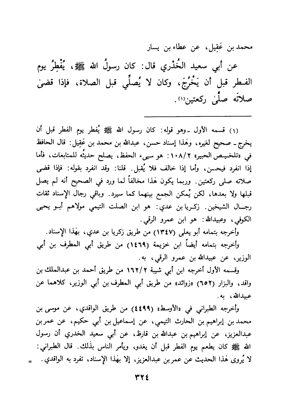 مُحَمَّدِ بْنِ عَقِيلٍ، عَنْ عَطَاءِ بْنِ يَسَارٍ، عَنْ أَبِي سَعِيدٍ الْخُدْرِيِّ، قَالَ: " كَانَ رَسُولُ اللهِ صَلَّى اللهُ عَلَيْهِ وَسَلَّمَ يُفْطِرُ يَوْمَ الْفِطْرِ قَبْلَ أَنْ يَخْرُجَ، وَكَانَ لَا يُصَلِّي قَبْلَ الصَّلَاةِ، فَإِذَا قَضَى صَلَاتَهُ صَلَّى رَكْعَتَيْنِ " (١)