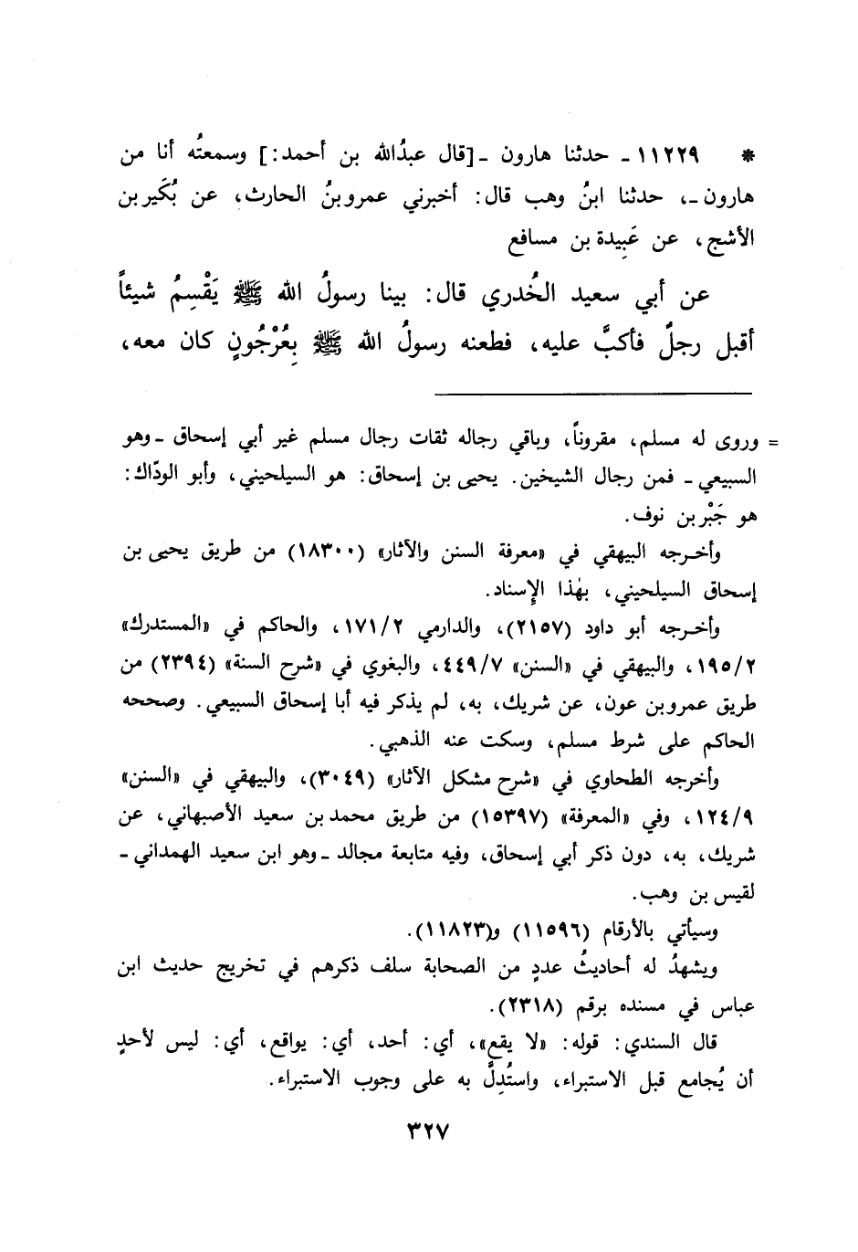 * ١١٢٢٩ - حَدَّثَنَا هَارُونُ، قَالَ عَبْدُ اللهِ بْنُ أَحْمَدَ: وسَمِعْتُهُ أَنَا مِنْ هَارُونَ، حَدَّثَنَا ابْنُ وَهْبٍ، قَالَ: أَخْبَرَنِي عَمْرُو بْنُ الْحَارِثِ، عَنْ بُكَيْرِ بْنِ الْأَشَجِّ، عَنْ عَبِيدَةَ بْنِ مُسَافِعٍ، عَنْ أَبِي سَعِيدٍ الْخُدْرِيِّ، قَالَ: بَيْنَا رَسُولُ اللهِ صَلَّى اللهُ عَلَيْهِ وَسَلَّمَ يَقْسِمُ شَيْئًا، أَقْبَلَ رَجُلٌ فَأَكَبَّ عَلَيْهِ، فَطَعَنَهُ رَسُولُ اللهِ صَلَّى اللهُ عَلَيْهِ وَسَلَّمَ بِعُرْجُونٍ كَانَ مَعَهُ،