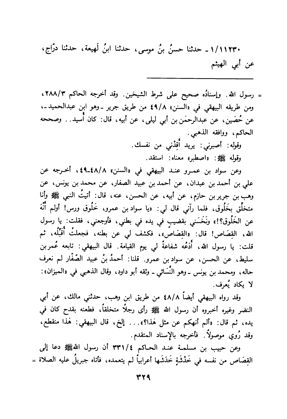 وعن حبيب بن مسلمة عند الحاكم ٤/٣٣١ أن رسول الله صَلَّى اللهُ عَلَيْهِ وَسَلَّمَ دعا إلى القصاص من نفسه في خدْشةٍ خدشها أعرابياً لم يتعمده، فأتاه جبريلُ عليه الصلاة =