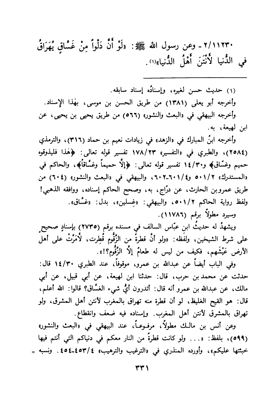 وفي الباب أيضاً عن عبد الله بن عمرو، موقوفاً، عند الطبري ٣٠/١٤ قال: حدثت عن محمد بن حرب، قال: حدثنا ابن لهيعة، عن أبي قبيل، عن أبي مالك، عن عبد الله بن عمرو أنه قال: أتدرون أي شيء الغساق؟ قالوا: الله أعلم، قال: هو القيح الغليظ، لو أن قطرة منه تهراق بالمغرب لأنتن أهل المشرق، ولو تهراق بالمشرق لأنتن أهل المغرب. وإسناده فيه ضعف وانقطاع.