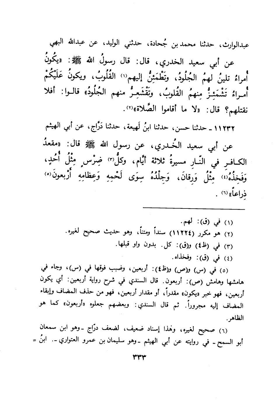 ١١٢٣٢ - حَدَّثَنَا حَسَنٌ، حَدَّثَنَا ابْنُ لَهِيعَةَ، حَدَّثَنَا دَرَّاجٌ، عَنْ أَبِي الْهَيْثَمِ، عَنْ أَبِي سَعِيدٍ الْخُدْرِيِّ، عَنْ رَسُولِ اللهِ صَلَّى اللهُ عَلَيْهِ وَسَلَّمَ قَالَ: " مَقْعَدُ الْكَافِرِ فِي النَّارِ مَسِيرَةُ ثَلَاثَةِ أَيَّامٍ، وَكُلُّ (٣) ضِرْسٍ مِثْلُ أُحُدٍ (٤) ، وَفَخِذُهُ مِثْلُ وَرِقَانَ، وَجِلْدُهُ سِوَى لَحْمِهِ وَعِظَامِهِ أَرْبَعُونَ (٥) ذِرَاعًا " (٦)