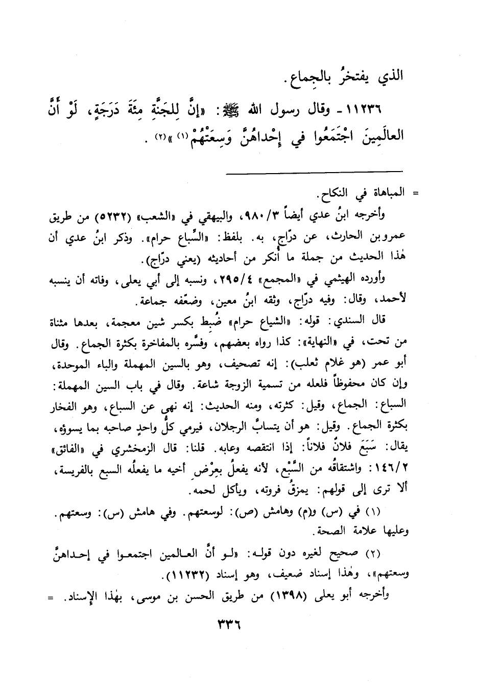 ١١٢٣٦ - وَقَالَ رَسُولُ اللهِ صَلَّى اللهُ عَلَيْهِ وَسَلَّمَ: " إِنَّ لِلْجَنَّةِ مِائَةَ دَرَجَةٍ، لَوْ أَنَّ الْعَالَمِينَ اجْتَمَعُوا فِي إِحْدَاهُنَّ وَسِعَتْهُمْ (١) " (٢)