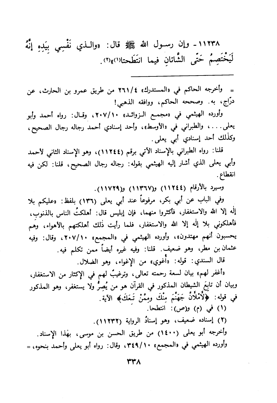 ١١٢٣٨ - وَإِنَّ رَسُولَ اللهِ صَلَّى اللهُ عَلَيْهِ وَسَلَّمَ قَالَ: " وَالَّذِي نَفْسِي بِيَدِهِ إِنَّهُ لَيَخْتَصِمُ حَتَّى الشَّاتَانِ فِيمَا انْتَطَحَتَا (١) " (٢)