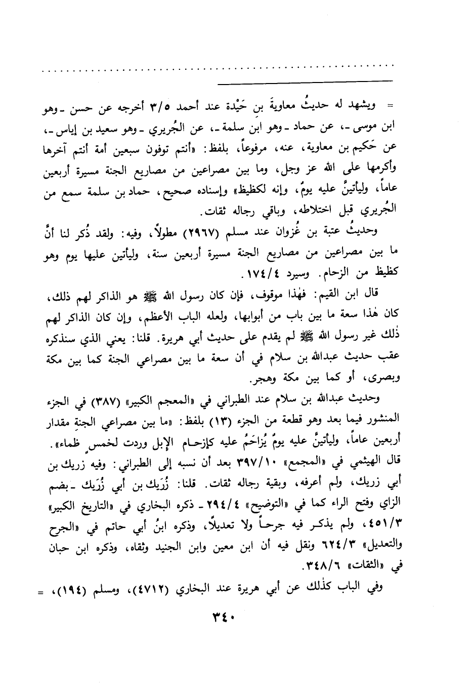 وحديث عبد الله بن سلام عند الطبراني في "المعجم الكبير" (٣٨٧) في الجزء المنشور فيما بعد وهو قطعة من الجزء (١٣) بلفظ: "ما بين مصراعي الجنة مقدار أربعين عاماً، وليأتين عليه يوم يُزاحمُ عليه كإزحام الإبل وردت لخمس ظماء".