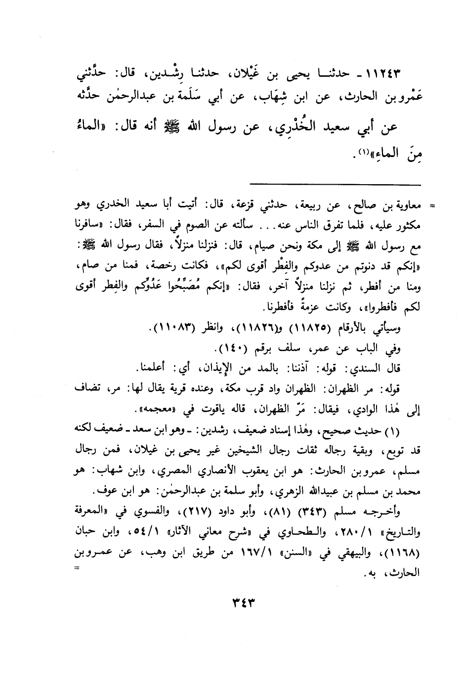 ١١٢٤٣ - حَدَّثَنَا يَحْيَى بْنُ غَيْلَانَ، حَدَّثَنَا رِشْدِينُ، قَالَ: حَدَّثَنِي عَمْرُو بْنُ الْحَارِثِ، عَنِ ابْنِ شِهَابٍ، عَنْ أَبِي سَلَمَةَ بْنِ عَبْدِ الرَّحْمَنِ، حَدَّثَهُ عَنْ أَبِي سَعِيدٍ الْخُدْرِيِّ، عَنْ رَسُولِ اللهِ صَلَّى اللهُ عَلَيْهِ وَسَلَّمَ أَنَّهُ قَالَ: " الْمَاءُ مِنَ الْمَاءِ " (١)