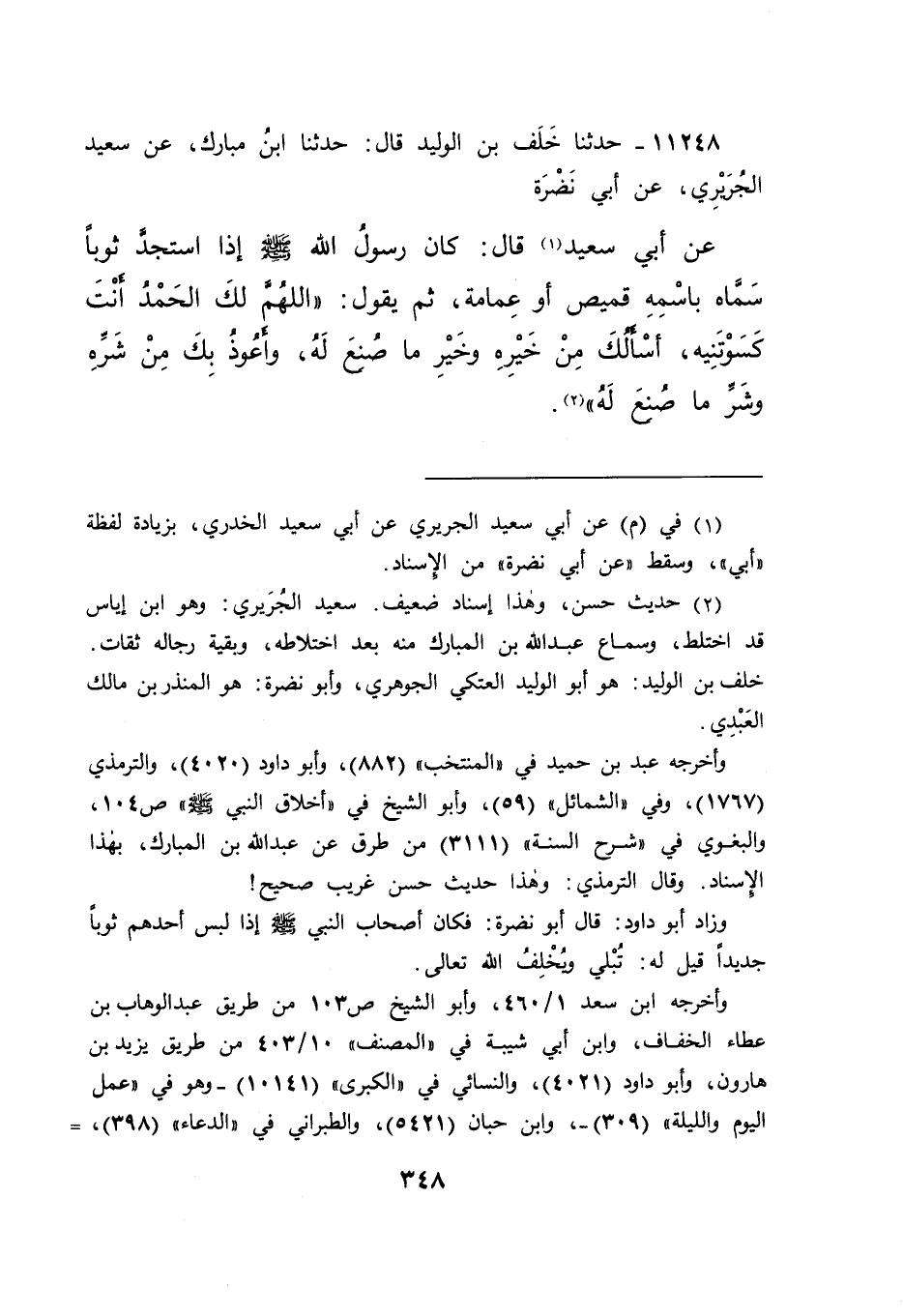 ١١٢٤٨ - حَدَّثَنَا خَلَفُ بْنُ الْوَلِيدِ، قَالَ: حَدَّثَنَا ابْنُ مُبَارَكٍ، عَنْ سَعِيدٍ الْجُرَيْرِيِّ، عَنْ أَبِي نَضْرَةَ، عَنْ أَبِي سَعِيدٍ (١) ، قَالَ: كَانَ رَسُولُ اللهِ صَلَّى اللهُ عَلَيْهِ وَسَلَّمَ إِذَا اسْتَجَدَّ ثَوْبًا سَمَّاهُ بِاسْمِهِ قَمِيصٌ - أَوْ عِمَامَةٌ - ثُمَّ يَقُولُ: " اللهُمَّ لَكَ الْحَمْدُ، أَنْتَ كَسَوْتَنِيهِ، أَسْأَلُكَ مِنْ خَيْرِهِ وَخَيْرِ مَا صُنِعَ لَهُ، وَأَعُوذُ بِكَ مِنْ شَرِّهِ وَشَرِّ مَا صُنِعَ لَهُ " (٢)