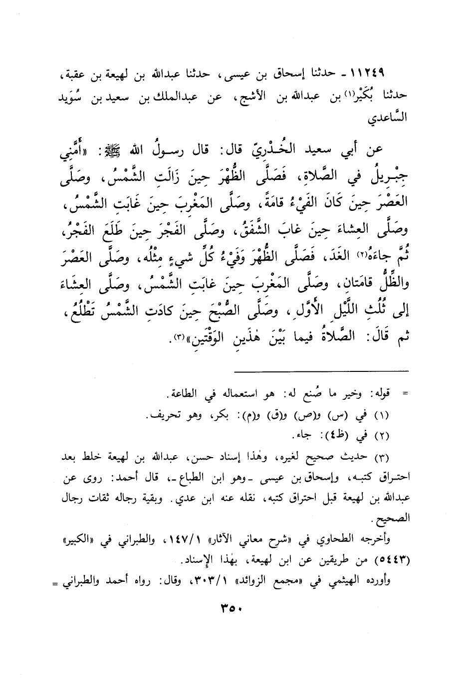 ١١٢٤٩ - حَدَّثَنَا إِسْحَاقُ بْنُ عِيسَى، حَدَّثَنَا عَبْدُ اللهِ بْنُ لَهِيعَةَ بْنِ عُقْبَةَ، حَدَّثَنَا بُكَيْرُ (١) بْنُ عَبْدِ اللهِ بْنِ الْأَشَجِّ، عَنْ عَبْدِ الْمَلِكِ بْنِ سَعِيدِ بْنِ سُوَيْدٍ السَّاعِدِيِّ، عَنْ أَبِي سَعِيدٍ الْخُدْرِيِّ، قَالَ: قَالَ رَسُولُ اللهِ صَلَّى اللهُ عَلَيْهِ وَسَلَّمَ: " أَمَّنِي جِبْرِيلُ فِي الصَّلَاةِ، فَصَلَّى الظُّهْرَ حِينَ زَالَتِ الشَّمْسُ، وَصَلَّى الْعَصْرَ حِينَ كَانَ الْفَيْءُ قَامَةً، وَصَلَّى الْمَغْرِبَ حِينَ غَابَتِ الشَّمْسُ، وَصَلَّى الْعِشَاءَ حِينَ غَابَ الشَّفَقُ، وَصَلَّى الْفَجْرَ حِينَ طَلَعَ الْفَجْرُ، ثُمَّ جَاءَهُ (٢) الْغَدُ، فَصَلَّى الظُّهْرَ وَفَيْءُ كُلِّ شَيْءٍ مِثْلُهُ، وَصَلَّى الْعَصْرَ وَالظِّلُّ قَامَتَانِ، وَصَلَّى الْمَغْرِبَ حِينَ غَابَتِ الشَّمْسُ، وَصَلَّى الْعِشَاءَ إِلَى ثُلُثِ اللَّيْلِ الْأَوَّلِ، وَصَلَّى الصُّبْحَ حِينَ كَادَتِ الشَّمْسُ تَطْلُعُ، ثُمَّ قَالَ: الصَّلَاةُ فِيمَا بَيْنَ هَذَيْنِ الْوَقْتَيْنِ " (٣)
