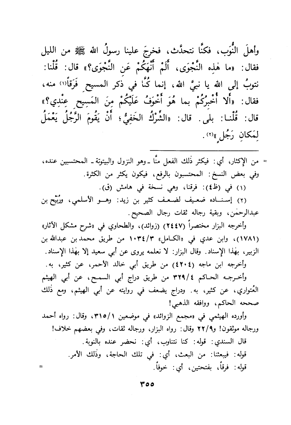 وَأَهْلُ النُّوَبِ، فَكُنَّا نَتَحَدَّثُ فَخَرَجَ عَلَيْنَا رَسُولُ اللهِ صَلَّى اللهُ عَلَيْهِ وَسَلَّمَ مِنَ اللَّيْلِ فَقَالَ: " مَا هَذِهِ النَّجْوَى؟ أَلَمْ أَنْهَكُمْ عَنِ النَّجْوَى " قَالَ: قُلْنَا نَتُوبُ إِلَى اللهِ يَا نَبِيَّ اللهِ، إِنَّمَا كُنَّا فِي ذِكْرِ الْمَسِيحِ فَرَقًا (١) مِنْهُ، فَقَالَ: " أَلَا أُخْبِرُكُمْ بِمَا هُوَ أَخْوَفُ عَلَيْكُمْ مِنَ الْمَسِيحِ عِنْدِي " قَالَ: قُلْنَا: بَلَى، قَالَ: " الشِّرْكُ الْخَفِيُّ: أَنْ يَقُومَ الرَّجُلُ يَعْمَلُ لِمَكَانِ رَجُلٍ " (٢)