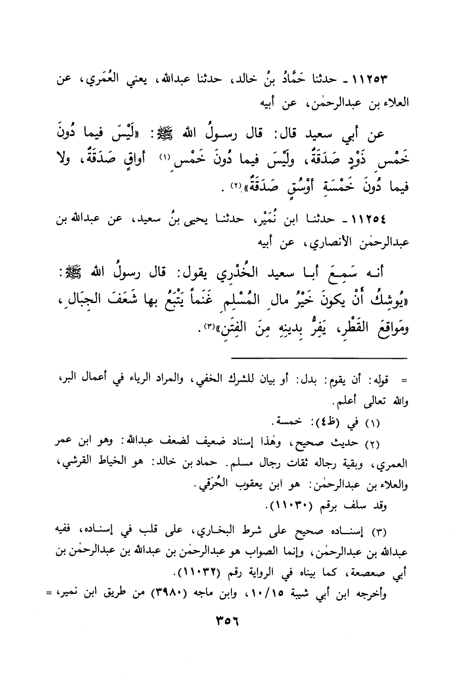 ١١٢٥٣ - حَدَّثَنَا حَمَّادُ بْنُ خَالِدٍ، حَدَّثَنَا عَبْدُ اللهِ يَعْنِي الْعُمَرِيَّ، عَنِ الْعَلَاءِ بْنِ عَبْدِ الرَّحْمَنِ، عَنْ أَبِيهِ، عَنْ أَبِي سَعِيدٍ، قَالَ: قَالَ رَسُولُ اللهِ صَلَّى اللهُ عَلَيْهِ وَسَلَّمَ: " لَيْسَ فِيمَا دُونَ خَمْسِ ذَوْدٍ صَدَقَةٌ، وَلَيْسَ فِيمَا دُونَ خَمْسِ (١) أَوَاقٍ صَدَقَةٌ، وَلَا فِيمَا دُونَ خَمْسَةِ أَوْسُقٍ صَدَقَةٌ " (٢)