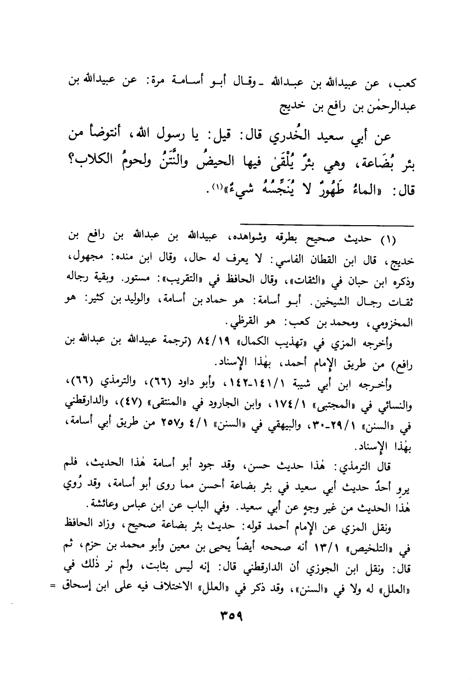 كَعْبٍ، عَنْ عُبَيْدِ اللهِ بْنِ عَبْدِ اللهِ، وَقَالَ أَبُو أُسَامَةَ مَرَّةً: عَنْ عُبَيْدِ اللهِ بْنِ عَبْدِ الرَّحْمَنِ بْنِ رَافِعِ بْنِ خَدِيجٍ، عَنْ أَبِي سَعِيدٍ الْخُدْرِيِّ، قَالَ: قِيلَ: يَا رَسُولَ اللهِ، أَنَتَوَضَّأُ مِنْ بِئْرِ بُضَاعَةَ، وَهِيَ بِئْرٌ يُلْقَى فِيهَا الْحِيَضُ وَالنَّتْنُ، وَلُحُومُ الْكِلَابِ؟ قَالَ: " الْمَاءُ طَهُورٌ، لَا يُنَجِّسُهُ شَيْءٌ " (١)
