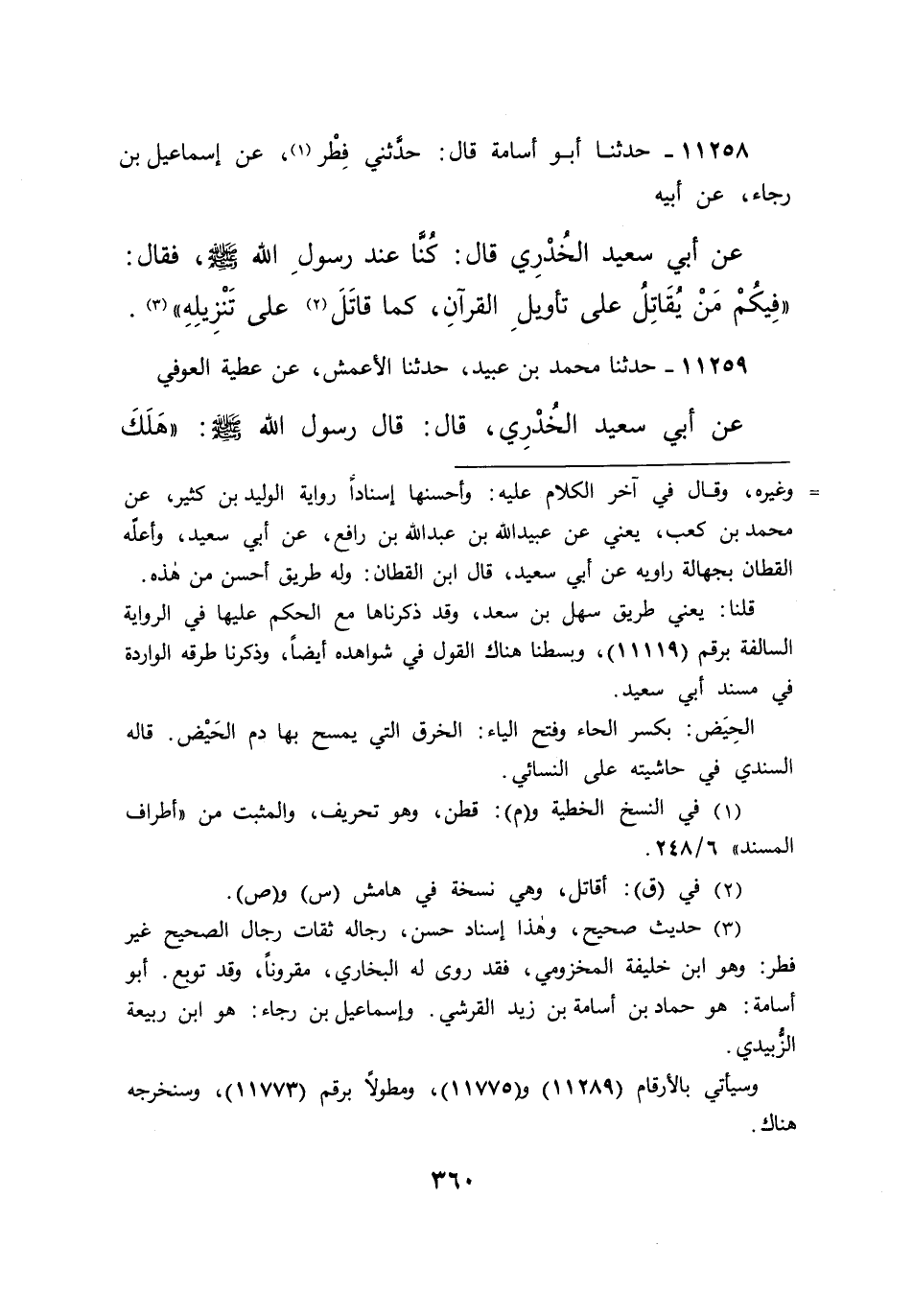 ١١٢٥٨ - حَدَّثَنَا أَبُو أُسَامَةَ، قَالَ: حَدَّثَنِي فِطْرٌ (١) ، عَنْ إِسْمَاعِيلَ بْنِ رَجَاءٍ، عَنْ أَبِيهِ، عَنْ أَبِي سَعِيدٍ الْخُدْرِيِّ، قَالَ: كُنَّا عِنْدَ رَسُولِ اللهِ صَلَّى اللهُ عَلَيْهِ وَسَلَّمَ فَقَالَ: " فِيكُمْ مَنْ يُقَاتِلُ عَلَى تَأْوِيلِ الْقُرْآنِ كَمَا قَاتَلَ (٢) عَلَى تَنْزِيلِهِ " (٣)