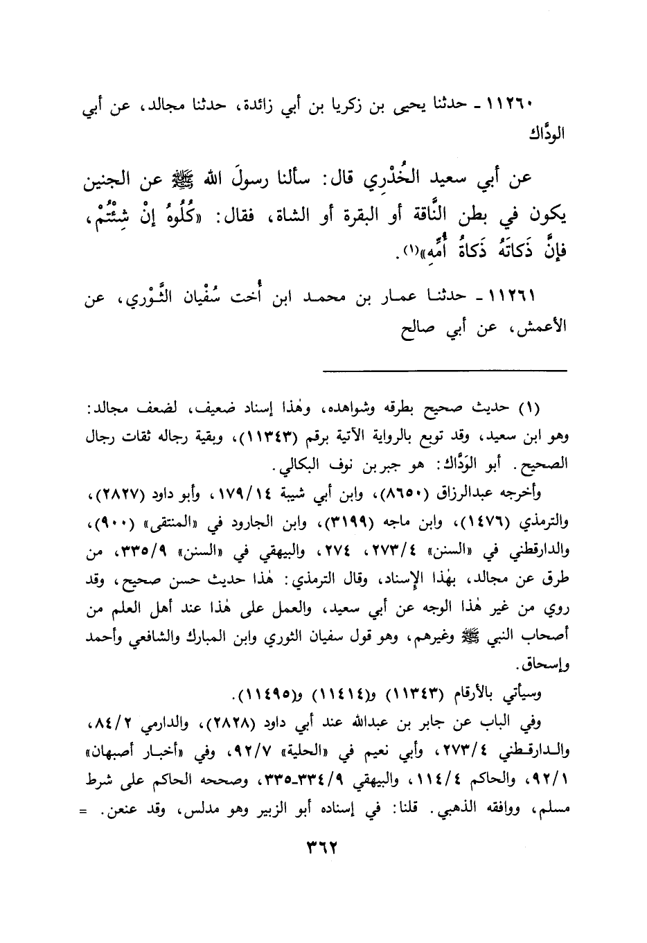 ١١٢٦٠ - حَدَّثَنَا يَحْيَى بْنُ زَكَرِيَّا بْنِ أَبِي زَائِدَةَ، حَدَّثَنَا مُجَالِدٌ، عَنْ أَبِي الْوَدَّاكِ، عَنْ أَبِي سَعِيدٍ الْخُدْرِيِّ، قَالَ: سَأَلْنَا رَسُولَ اللهِ صَلَّى اللهُ عَلَيْهِ وَسَلَّمَ عَنِ الْجَنِينِ، يَكُونُ فِي بَطْنِ النَّاقَةِ، أَوِ الْبَقَرَةِ، أَوِ الشَّاةِ؟ فَقَالَ: " كُلُوهُ إِنْ شِئْتُمْ فَإِنَّ ذَكَاتَهُ ذَكَاةُ أُمِّهِ " (١)