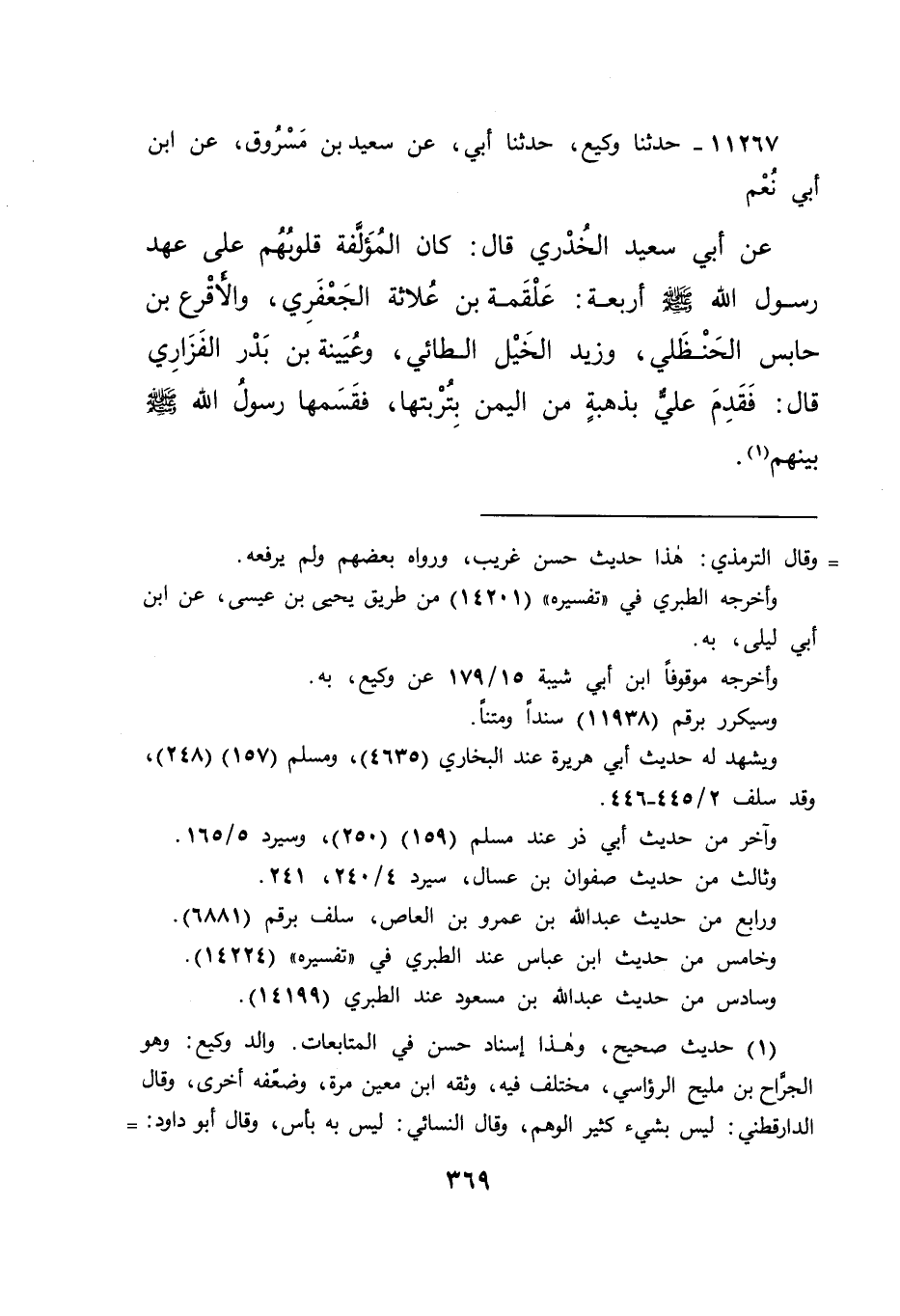 ١١٢٦٧ - حَدَّثَنَا وَكِيعٌ، حَدَّثَنَا أَبِي، عَنْ سَعِيدِ بْنِ مَسْرُوقٍ، عَنِ ابْنِ أَبِي نُعْمٍ، عَنْ أَبِي سَعِيدٍ الْخُدْرِيِّ، قَالَ: كَانَ الْمُؤَلَّفَةُ قُلُوبُهُمْ عَلَى عَهْدِ رَسُولِ اللهِ صَلَّى اللهُ عَلَيْهِ وَسَلَّمَ أَرْبَعَةً: عَلْقَمَةَ بْنَ عُلَاثَةَ الْجَعْفَرِيَّ، وَالْأَقْرَعَ بْنَ حَابِسٍ الْحَنْظَلِيَّ، وَزَيْدَ الْخَيْلِ الطَّائِيَّ، وَعُيَيْنَةَ بْنَ بَدْرٍ الْفَزَارِيَّ، قَالَ: فَقَدِمَ عَلِيٌّ بِذَهَبَةٍ مِنَ الْيَمَنِ بِتُرْبَتِهَا " فَقَسَمَهَا رَسُولُ اللهِ صَلَّى اللهُ عَلَيْهِ وَسَلَّمَ بَيْنَهُمْ " (١)