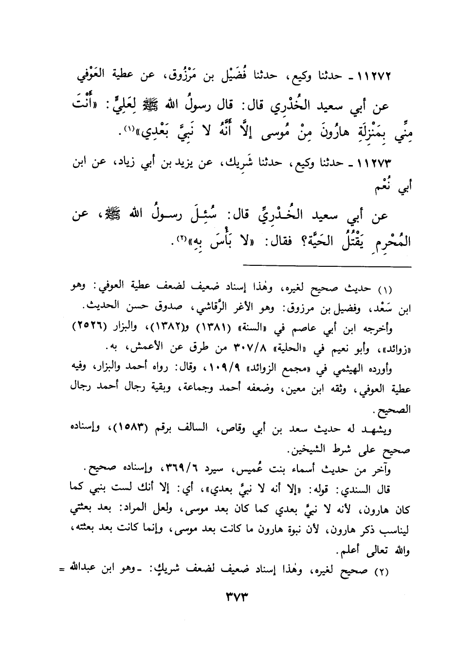 ١١٢٧٢ - حَدَّثَنَا وَكِيعٌ، حَدَّثَنَا فُضَيْلُ بْنُ مَرْزُوقٍ، عَنْ عَطِيَّةَ الْعَوْفِيِّ، عَنْ أَبِي سَعِيدٍ الْخُدْرِيِّ، قَالَ: قَالَ رَسُولُ اللهِ صَلَّى اللهُ عَلَيْهِ وَسَلَّمَ لِعَلِيٍّ: " أَنْتَ مِنِّي بِمَنْزِلَةِ هَارُونَ مِنْ مُوسَى، إِلَّا أَنَّهُ لَا نَبِيَّ بَعْدِي " (١)