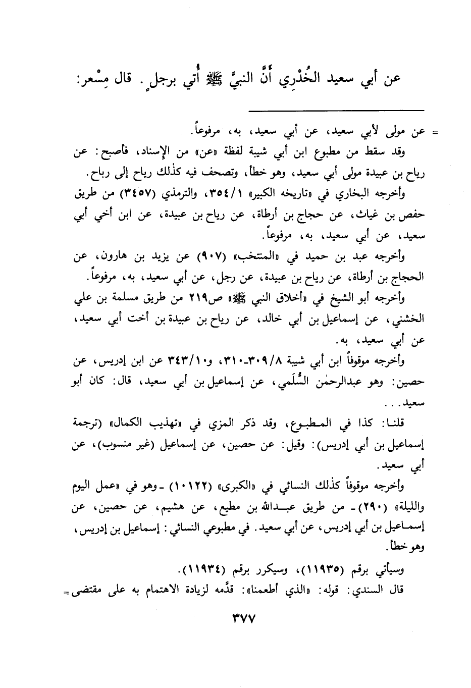 وقد سقط من مطبوع ابن أبي شيبة لفظة "عن" من الإسناد، فأصبح: عن رياح بن عبيدة مولى أبي سعيد، وهو خطأ، وتصحف فيه كذلك رياح إلى رباح.
