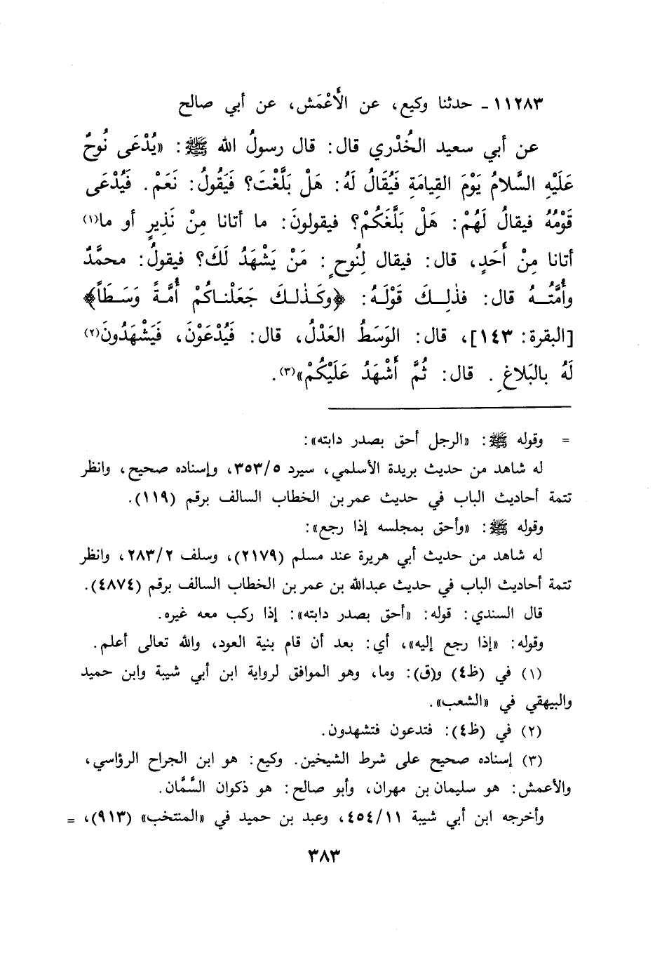 ١١٢٨٣ - حَدَّثَنَا وَكِيعٌ، عَنِ الْأَعْمَشِ، عَنْ أَبِي صَالِحٍ، عَنْ أَبِي سَعِيدٍ الْخُدْرِيِّ، قَالَ: قَالَ رَسُولُ اللهِ صَلَّى اللهُ عَلَيْهِ وَسَلَّمَ: " يُدْعَى نُوحٌ عَلَيْهِ السَّلَامُ يَوْمَ الْقِيَامَةِ، فَيُقَالُ لَهُ: هَلْ بَلَّغْتَ، فَيَقُولُ: نَعَمْ، فَيُدْعَى قَوْمُهُ، فَيُقَالُ لَهُمْ: هَلْ بَلَّغَكُمْ؟ فَيَقُولُونَ: مَا أَتَانَا مِنْ نَذِيرٍ - أَوْ مَا (١) أَتَانَا مِنْ أَحَدٍ - قَالَ: فَيُقَالُ لِنُوحٍ: مَنْ يَشْهَدُ لَكَ؟ فَيَقُولُ: مُحَمَّدٌ وَأُمَّتُهُ، قَالَ: فَذَلِكَ قَوْلُهُ: {وَكَذَلِكَ جَعَلْنَاكُمْ أُمَّةً وَسَطًا} [البقرة: ١٤٣] ، قَالَ: الْوَسَطُ الْعَدْلُ، قَالَ: فَيُدْعَوْنَ فَيَشْهَدُونَ (٢) لَهُ بِالْبَلَاغِ، قَالَ: ثُمَّ أَشْهَدُ عَلَيْكُمْ " (٣)