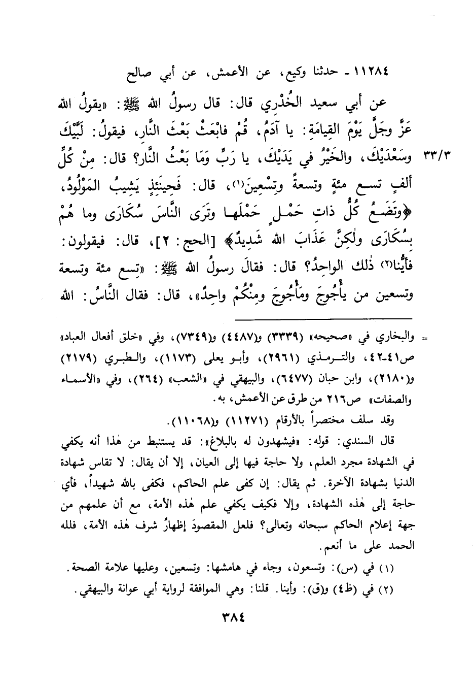١١٢٨٤ - حَدَّثَنَا وَكِيعٌ، عَنِ الْأَعْمَشِ، عَنْ أَبِي صَالِحٍ، عَنْ أَبِي سَعِيدٍ الْخُدْرِيِّ، قَالَ: قَالَ رَسُولُ اللهِ صَلَّى اللهُ عَلَيْهِ وَسَلَّمَ: " يَقُولُ اللهُ عَزَّ وَجَلَّ يَوْمَ الْقِيَامَةِ: يَا آدَمُ قُمْ فَابْعَثْ بَعْثَ النَّارِ، فَيَقُولُ: لَبَّيْكَ وَسَعْدَيْكَ وَالْخَيْرُ فِي يَدَيْكَ يَا رَبِّ، وَمَا بَعْثُ النَّارِ، قَالَ: مِنْ كُلِّ أَلْفٍ تِسْعَ مِائَةٍ وَتِسْعَةً وَتِسْعِينَ (١) ، قَالَ: فَحِينَئِذٍ يَشِيبُ الْمَوْلُودُ، {وَتَضَعُ كُلُّ ذَاتِ حَمْلٍ حَمْلَهَا، وَتَرَى النَّاسَ سُكَارَى وَمَا هُمْ بِسُكَارَى، وَلَكِنَّ عَذَابَ اللهِ شَدِيدٌ} [الحج: ٢] قَالَ: فَيَقُولُونَ: فَأَيُّنَا (٢) ذَلِكَ الْوَاحِدُ؟ قَالَ: فَقَالَ رَسُولُ اللهِ صَلَّى اللهُ عَلَيْهِ وَسَلَّمَ: " تِسْعَ مِائَةٍ وَتِسْعَةً وَتِسْعِينَ مِنْ يَأْجُوجَ وَمَأْجُوجَ وَمِنْكُمْ وَاحِدٌ " قَالَ: فَقَالَ النَّاسُ: اللهُ