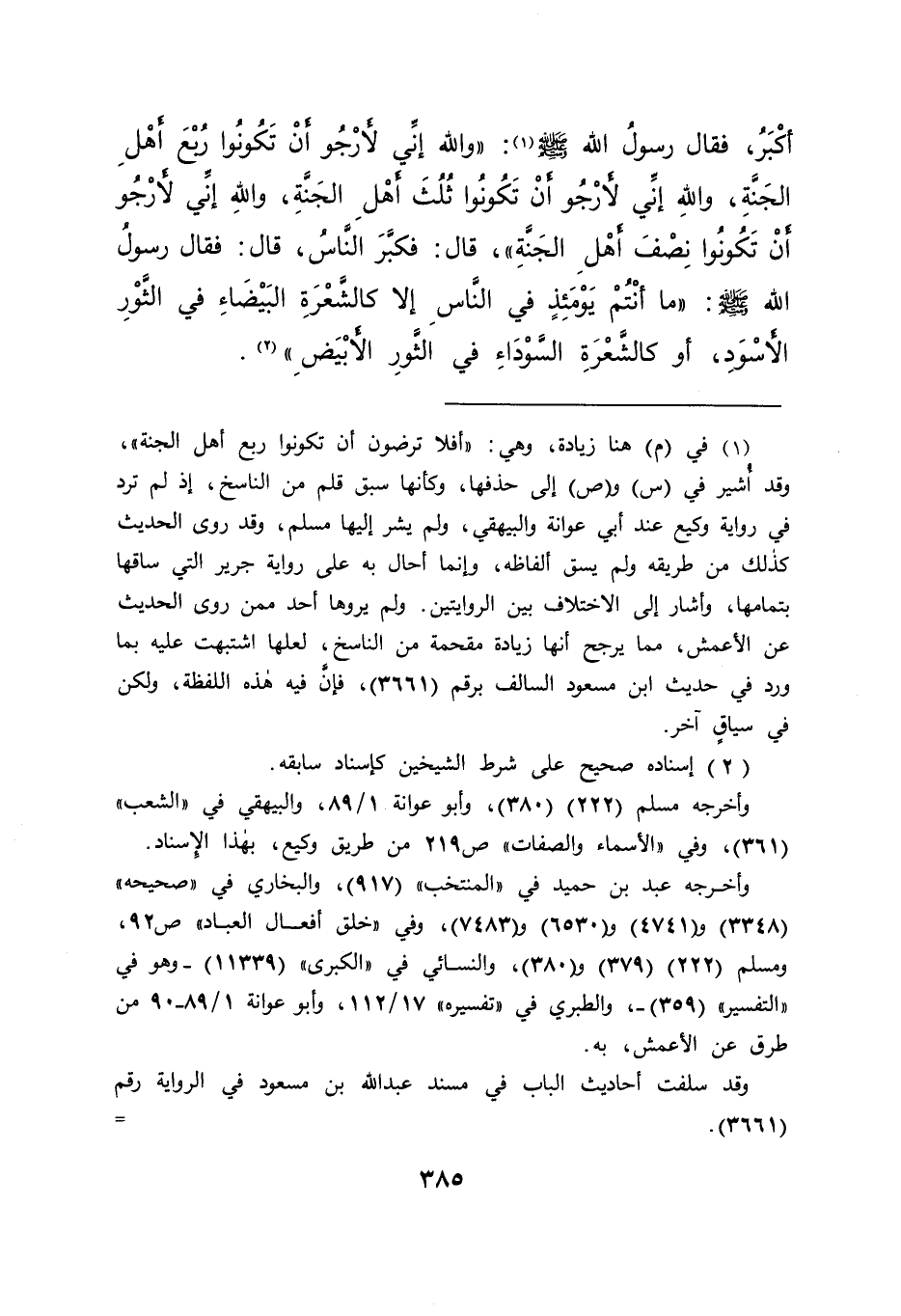 (١) في (م) هنا زيادة، وهي: "أفلا ترضون أن تكونوا ربع أهل الجنة"، وقد أشير في (س) و (ص) إلى حذفها، وكأنها سبق قلم من الناسخ، إذ لم ترد في رواية وكيع عند أبي عوانة والبيهقي، ولم يشر إليها مسلم، وقد روى الحديث كذلك من طريقه ولم يسق ألفاظه، وإنما أحال به على رواية جرير التي ساقها بتمامها، وأشار إلى الاختلاف بين الروايتين. ولم يروها أحد ممن روى الحديث عن الأعمش، مما يرجح أنها زيادة مقحمة من الناسخ، لعلها اشتبهت عليه بما ورد في حديث ابن مسعود السالف برقم (٣٦٦١) ، فإن فيه هذه اللفظة، ولكن في سياقٍ آخر.