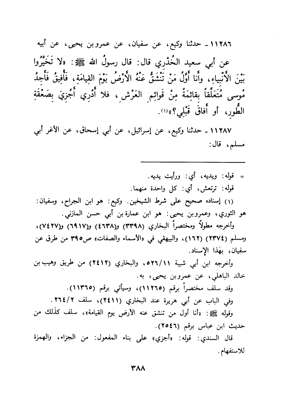 ١١٢٨٦ - حَدَّثَنَا وَكِيعٌ، عَنْ سُفْيَانَ، عَنْ عَمْرِو بْنِ يَحْيَى، عَنْ أَبِيهِ، عَنْ أَبِي سَعِيدٍ الْخُدْرِيِّ، قَالَ: قَالَ رَسُولُ اللهِ صَلَّى اللهُ عَلَيْهِ وَسَلَّمَ: " لَا تُخَيِّرُوا بَيْنَ الْأَنْبِيَاءِ، وَأَنَا أَوَّلُ مَنْ تَنْشَقُّ عَنْهُ الْأَرْضُ يَوْمَ الْقِيَامَةِ، فَأَفِيقُ فَأَجِدُ مُوسَى مُتَعَلِّقًا بِقَائِمَةٍ مِنْ قَوَائِمِ الْعَرْشِ، فَلَا أَدْرِي أَجُزِيَ بِصَعْقَةِ الطُّورِ، أَوْ أَفَاقَ قَبْلِي " (١)