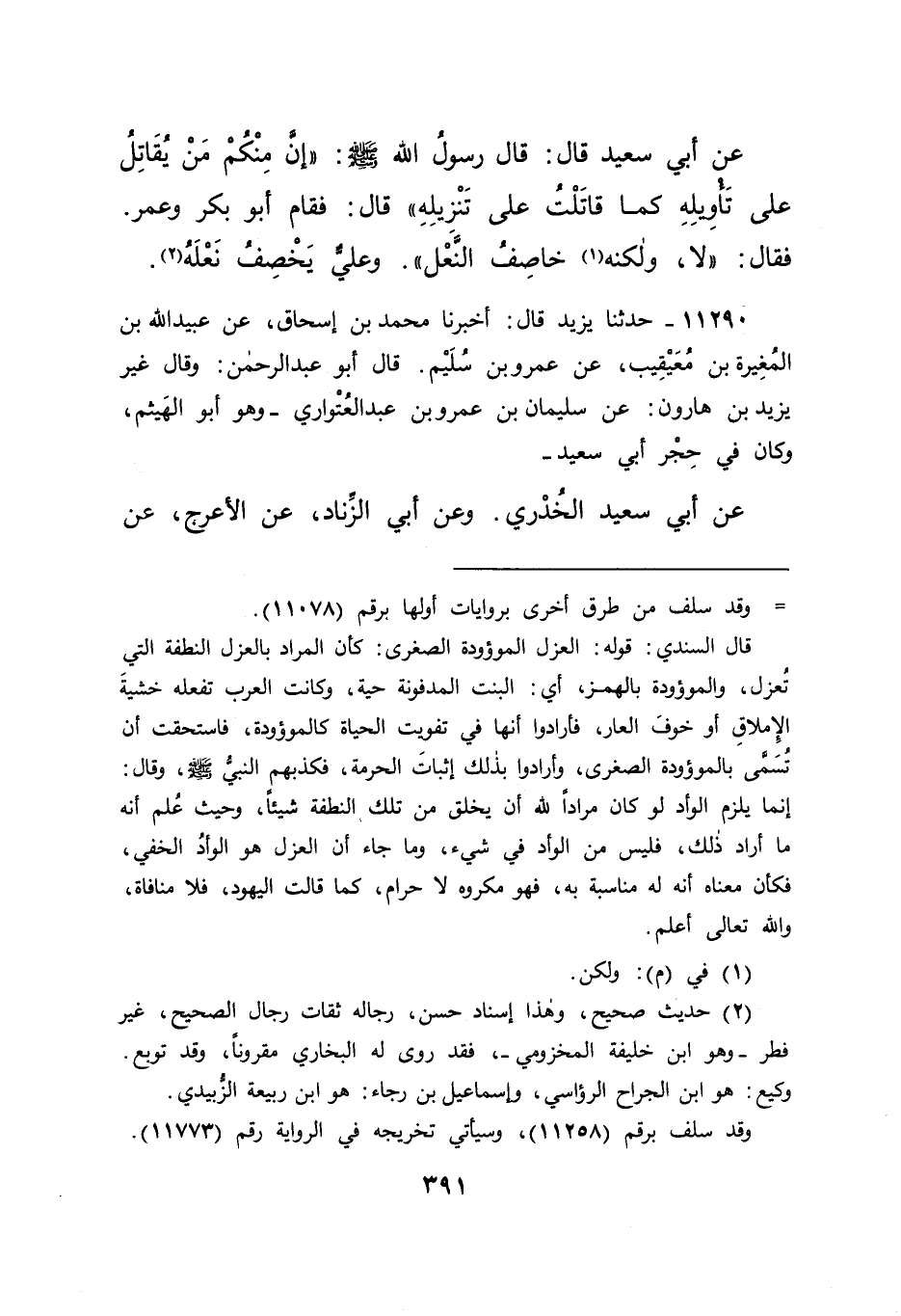 عَنْ أَبِي سَعِيدٍ، قَالَ: قَالَ رَسُولُ اللهِ صَلَّى اللهُ عَلَيْهِ وَسَلَّمَ: " إِنَّ مِنْكُمْ مَنْ يُقَاتِلُ عَلَى تَأْوِيلِهِ، كَمَا قَاتَلْتُ عَلَى تَنْزِيلِهِ " قَالَ: فَقَامَ أَبُو بَكْرٍ، وَعُمَرُ فَقَالَ: " لَا وَلَكِنَّهُ (١) خَاصِفُ النَّعْلِ "، وَعَلِيٌّ يَخْصِفُ نَعْلَهُ (٢)