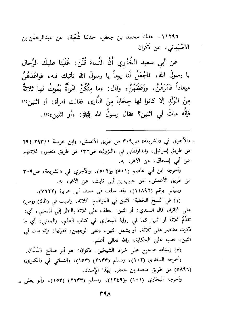١١٢٩٦ - حَدَّثَنَا مُحَمَّدُ بْنُ جَعْفَرٍ، حَدَّثَنَا شُعْبَةُ، عَنْ عَبْدِ الرَّحْمَنِ بْنِ الْأَصْبَهَانِيِّ، عَنْ ذَكْوَانَ، عَنْ أَبِي سَعِيدٍ الْخُدْرِيِّ، أَنَّ النِّسَاءَ قُلْنَ: غَلَبَنَا عَلَيْكَ الرِّجَالُ يَا رَسُولَ اللهِ، فَاجْعَلْ لَنَا يَوْمًا يَا رَسُولَ اللهِ نَأْتِيكَ فِيهِ، فَوَاعَدَهُنَّ مِيعَادًا، فَأَمَرَهُنَّ وَوَعَظَهُنَّ، وَقَالَ: " مَا مِنْكُنَّ امْرَأَةٌ يَمُوتُ لَهَا ثَلَاثَةٌ مِنَ الْوَلَدِ، إِلَّا كَانُوا لَهَا حِجَابًا مِنَ النَّارِ " فَقَالَتِ امْرَأَةٌ: أَوِ اثْنَيْنِ (١) ؟ فَإِنَّهُ مَاتَ لِي اثْنَيْنِ، فَقَالَ رَسُولُ اللهِ صَلَّى اللهُ عَلَيْهِ وَسَلَّمَ: "أَوِ اثْنَيْنِ" (٢)