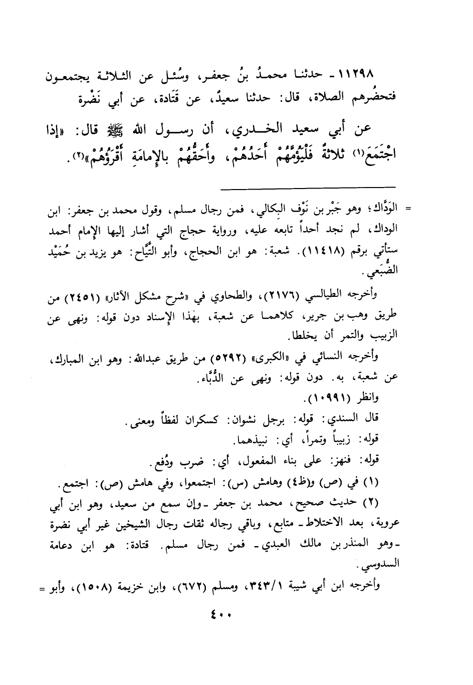 ١١٢٩٨ - حَدَّثَنَا مُحَمَّدُ بْنُ جَعْفَرٍ، وَسُئِلَ عَنِ الثَّلَاثَةِ يَجْتَمِعُونَ فَتَحْضُرُهُمُ الصَّلَاةُ؟ قَالَ: حَدَّثَنَا سَعِيدٌ، عَنْ قَتَادَةَ، عَنْ أَبِي نَضْرَةَ، عَنْ أَبِي سَعِيدٍ الْخُدْرِيِّ، أَنَّ رَسُولَ اللهِ صَلَّى اللهُ عَلَيْهِ وَسَلَّمَ قَالَ: " إِذَا اجْتَمَعَ (١) ثَلَاثَةٌ فَلْيَؤُمَّهُمْ أَحَدُهُمْ، وَأَحَقُّهُمْ بِالْإِمَامَةِ أَقْرَؤُهُمْ " (٢)