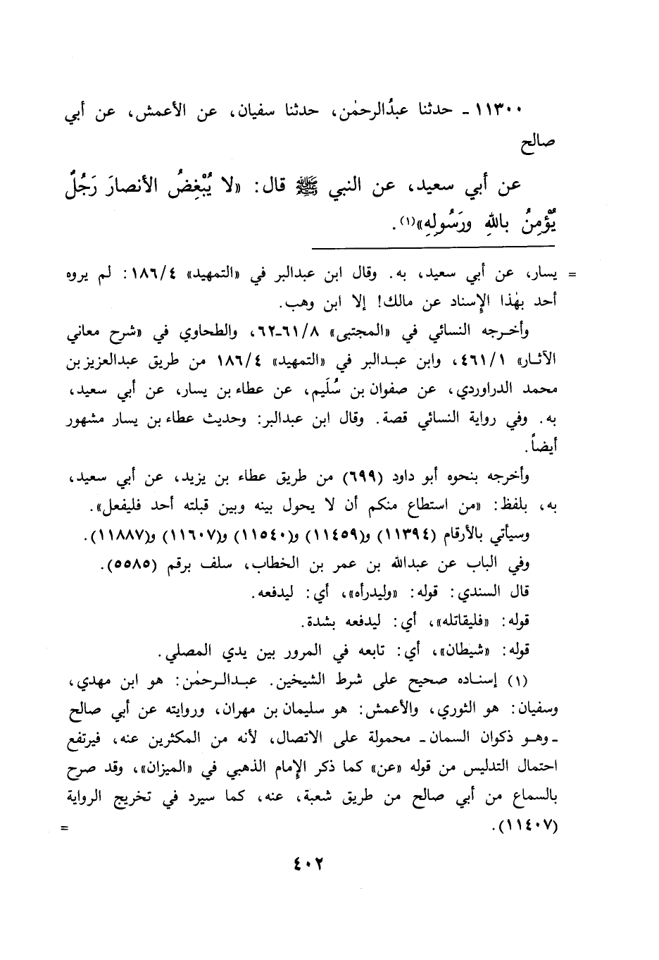 ١١٣٠٠ - حَدَّثَنَا عَبْدُ الرَّحْمَنِ، حَدَّثَنَا سُفْيَانُ، عَنِ الْأَعْمَشِ، عَنْ أَبِي صَالِحٍ، عَنْ أَبِي سَعِيدٍ، عَنِ النَّبِيِّ صَلَّى اللهُ عَلَيْهِ وَسَلَّمَ قَالَ: " لَا يَبْغُضُ الْأَنْصَارَ رَجُلٌ يُؤْمِنُ بِاللهِ وَرَسُولِهِ " (١)