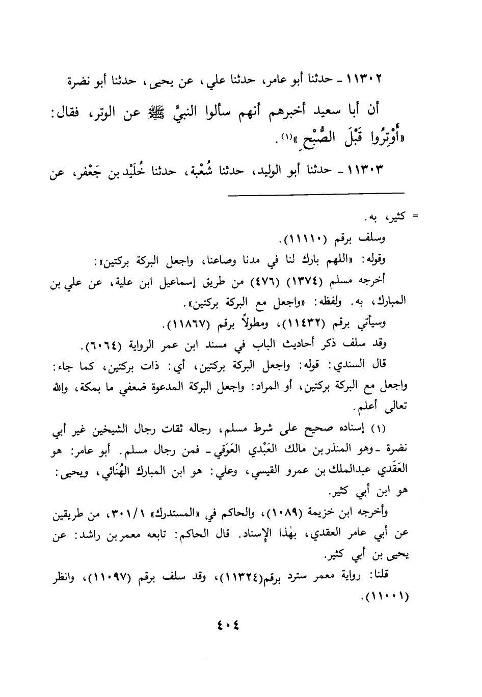 ١١٣٠٢ - حَدَّثَنَا أَبُو عَامِرٍ، حَدَّثَنَا عَلِيٌّ، عَنْ يَحْيَى، حَدَّثَنَا أَبُو نَضْرَةَ، أَنَّ أَبَا سَعِيدٍ، أَخْبَرَهُمْ أَنَّهُمْ سَأَلُوا النَّبِيَّ صَلَّى اللهُ عَلَيْهِ وَسَلَّمَ عَنِ الْوَتْرِ؟ فَقَالَ: " أَوْتِرُوا قَبْلَ الصُّبْحِ " (١)