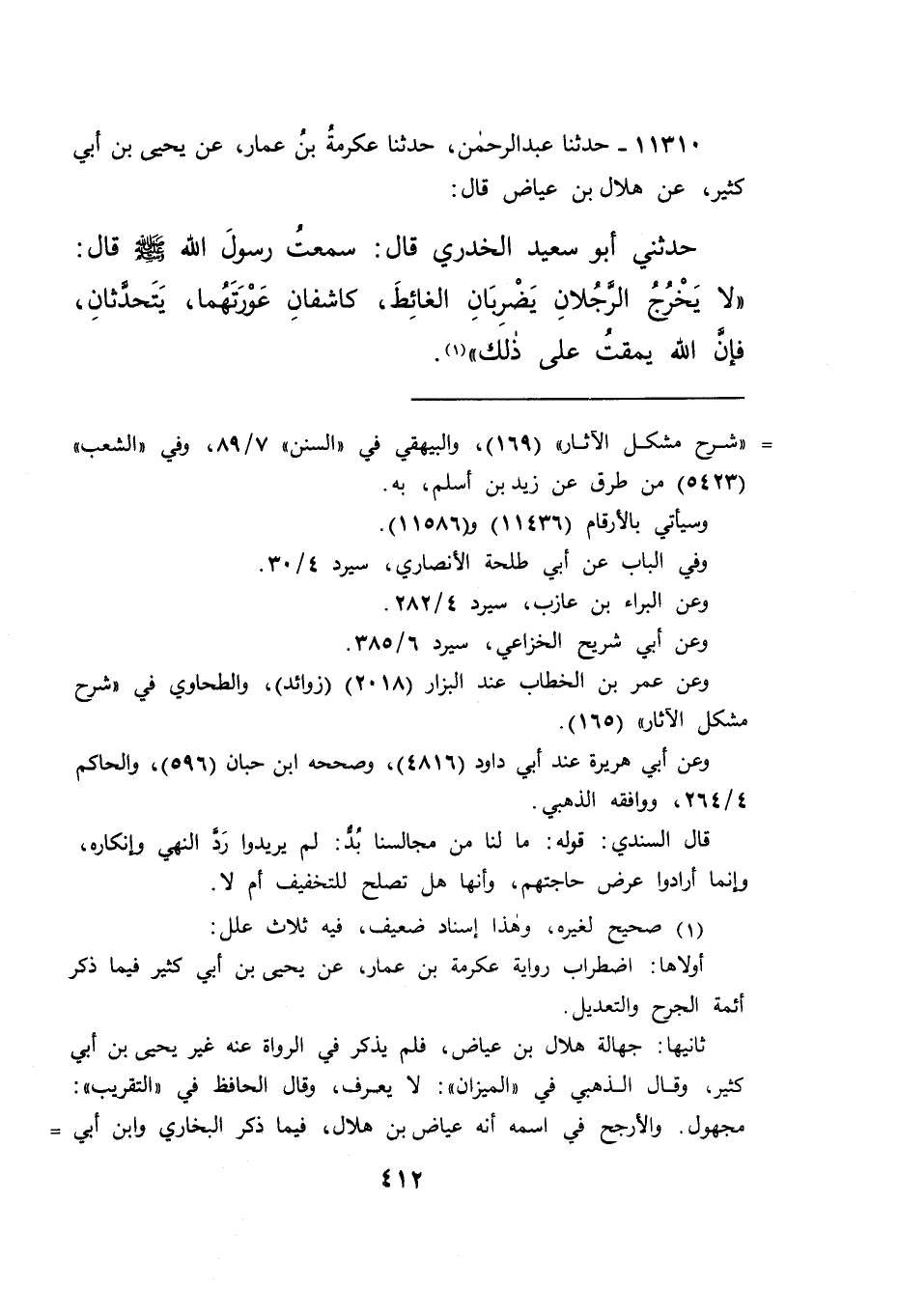 ١١٣١٠ - حَدَّثَنَا عَبْدُ الرَّحْمَنِ، حَدَّثَنَا عِكْرِمَةُ بْنُ عَمَّارٍ، عَنْ يَحْيَى بْنِ أَبِي كَثِيرٍ، عَنْ هِلَالِ بْنِ عِيَاضٍ، قَالَ: حَدَّثَنِي أَبُو سَعِيدٍ الْخُدْرِيُّ، قَالَ: سَمِعْتُ رَسُولَ اللهِ صَلَّى اللهُ عَلَيْهِ وَسَلَّمَ قَالَ: " لَا يَخْرُجِ الرَّجُلَانِ يَضْرِبَانِ الْغَائِطَ كَاشِفَانِ عَوْرَتَهُمَا يَتَحَدَّثَانِ، فَإِنَّ اللهَ يَمْقُتُ عَلَى ذَلِكَ " (١)